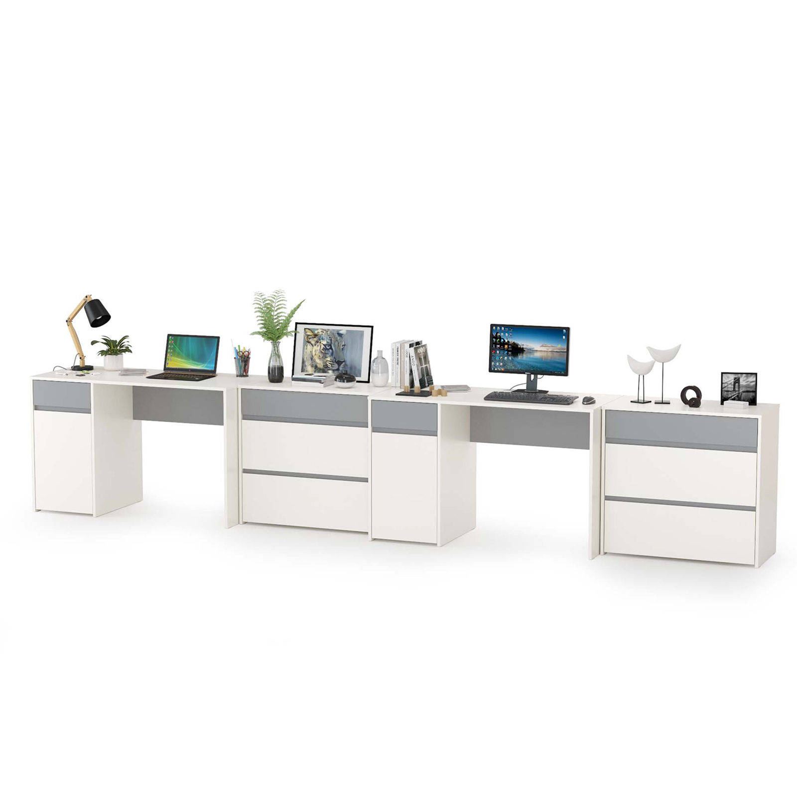 Комплектация включает два однотумбовых стола и два комода. Конструктивно каждый стол включает всестительную столешницу и тумбу под ней. Тумба каждого стола имеет удобное распашное отделение с полкой внутри и выдвижным ящиком над ним на шариковых направляющих полного выдвижения. Универсальная сборка - сторону расположения тумбы Вы определяете сами. Комод конструктивно представляет из себя два комода объединеных в единый блок. Состоит из шести выдвижных ящиков на шариковых направляющих полного выдвижения, позволит хранить вещи в полном порядке. Отсутствие лицевой фурнитуры и открывание фасадов за край - не только стилевое, но функциональное решение. Так мебель занимает меньше места и дает возможность проходить вплотную с фасадом без риска зацепиться за ручку или травмироваться. Базовый белый цвет, сочетаясь с акцентным серым, создаёт нейтральную основу интерьера, чтобы подчеркнуть личные вещи и аксессуары. Корпуса и фасады мебели изготовлены из экологически чистой ламинированной ДСП 16 мм, торцы окромлены ПХВ плёнкой 0,4 мм. В производстве молодёжной Торонто использованы качественные материалы и фурнитура - можно разрабатывать проект на весь период обучения. Поставляется два письменных стола и два комода Торонто № 14 в разобранном виде, надёжно упакованной в гофрокартон, с приложенной подробной инструкцией по сборке.