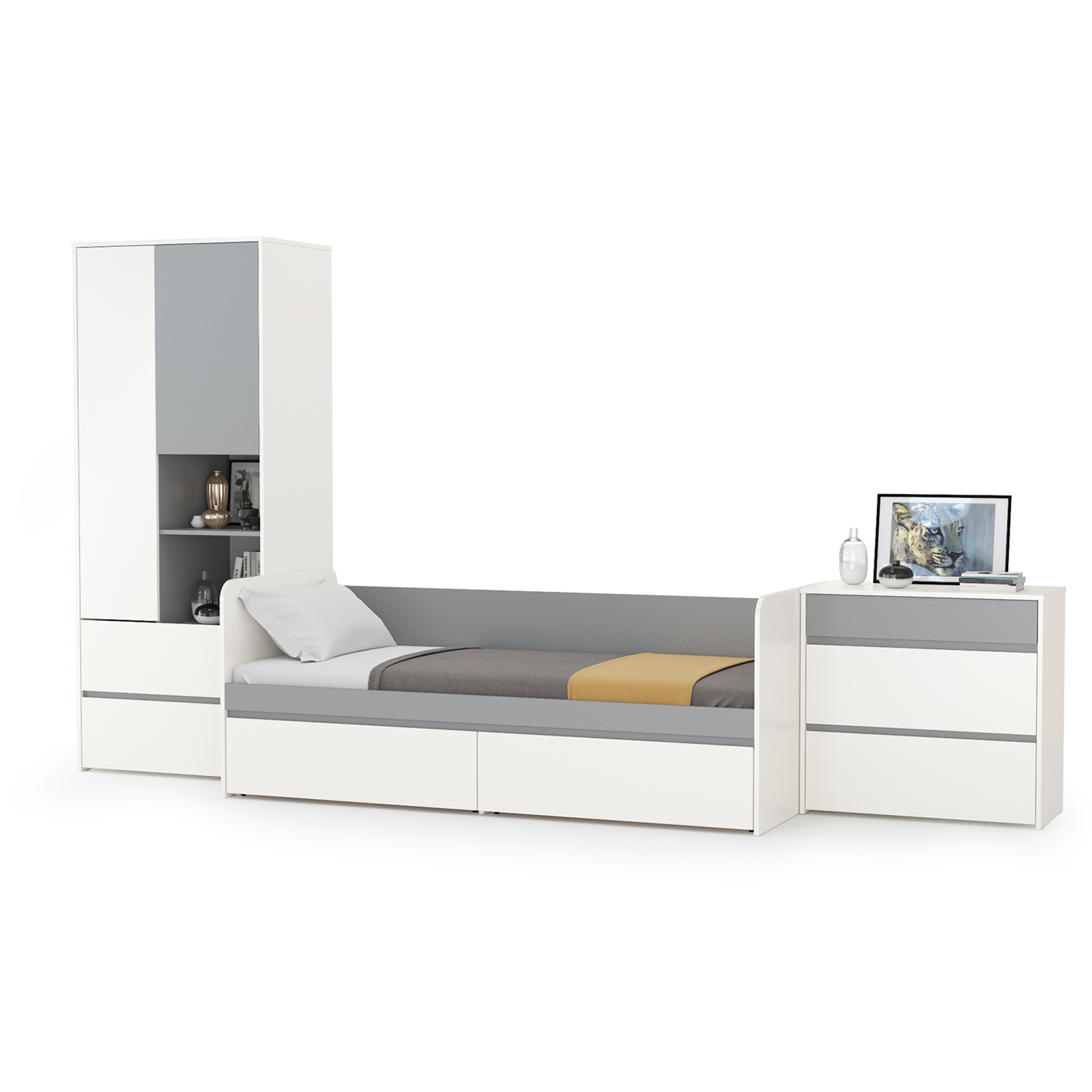 Комплектация состоит из детской кровати, шкафа для одежды и комода. Прелестная кровать с ящиками выполнена в виде диванчика - задняя спинка и скругленные подлокотники из ЛДСП. Спальное место - 800х1900 мм. Основание под матрас (ламинированная древесно-стружечная плита 16 мм.) в комплекте. Матрас 900х2000 мм. для кровати с ящиками Торонто 11.39 приобретается отдельно. Рекомендуемая максимальная высота матраса - 180 мм. В основании кровати оборудованы два выдвижных ящика для постельных принадлежностей и личных вещей ребёнка. Ящики достаточно вместительные и установлены на колесные опоры, что обеспечивает им легкое выдвижение. Шкаф оборудован горизонтальной штангой для одежды на плечиках за дверкой с одной стороны. С другой три полки, верхние две за распашной дверкой. В нижней части шкаф располагат двумя выдвижными ящиками на шариковых направляющих полного выдвижения обеспечивают длительную и тихую эксплуатацию. На внутренней стороне дверки отделения с штангой расположено зеркало. Шкаф для одежды Торонто 13.333 собирается на любую сторону, что позволяет расширить возможности по расстановке мебели. Распашные двери шкафа на четырёхшарнирных петлях без доводчиков. Комод состоит из трех выдвижных ящиков на шариковых направляющих полного выдвижения, позволит хранить вещи в полном порядке. Отсутствие лицевой фурнитуры и открывание фасадов за край - не только стилевое, но функциональное решение. Так мебель занимает меньше места и дает возможность проходить вплотную с фасадом без риска зацепиться за ручку или травмироваться. Базовый белый цвет, сочетаясь с акцентным серым, создаёт нейтральную основу интерьера, чтобы подчеркнуть личные вещи и аксессуары. Корпуса и фасады мебели изготовлены из экологически чистой ламинированной ДСП 16 мм, торцы окромлены ПХВ плёнкой 0,4 мм. В производстве молодёжной Торонто использованы качественные материалы и фурнитура - можно разрабатывать проект на весь период обучения. Поставляется молодёжная мебель Торонто № 21 в разобранном виде, надёжно упакованной в гофрокартон, с приложенной подробной инструкцией по сборке.