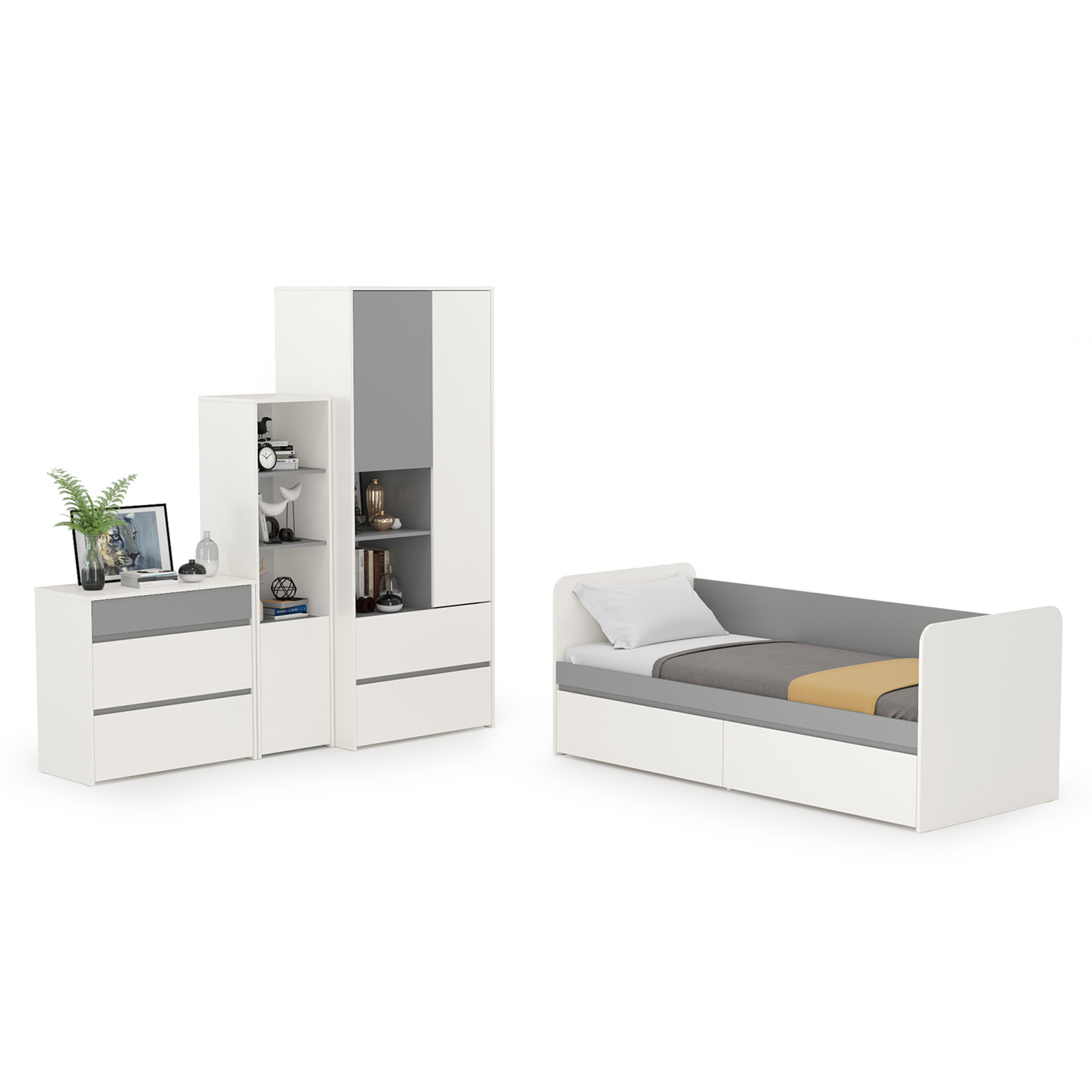 Комплектация состоит из детской кровати, шкафа для одежды, стеллажа и комода. Прелестная кровать с ящиками выполнена в виде диванчика - задняя спинка и скругленные подлокотники из ЛДСП. Спальное место - 800х1900 мм. Основание под матрас (ламинированная древесно-стружечная плита 16 мм.) в комплекте. Матрас 900х2000 мм. для кровати с ящиками Торонто 11.39 приобретается отдельно. Рекомендуемая максимальная высота матраса - 180 мм. В основании кровати оборудованы два выдвижных ящика для постельных принадлежностей и личных вещей ребёнка. Ящики достаточно вместительные и установлены на колесные опоры, что обеспечивает им легкое выдвижение. Шкаф оборудован горизонтальной штангой для одежды на плечиках за дверкой с одной стороны. С другой три полки, верхние две за распашной дверкой. В нижней части шкаф располагат двумя выдвижными ящиками на шариковых направляющих полного выдвижения обеспечивают длительную и тихую эксплуатацию. На внутренней стороне дверки отделения с штангой расположено зеркало. Шкаф для одежды Торонто 13.333 собирается на любую сторону, что позволяет расширить возможности по расстановке мебели. Стеллаж комбинированный включает - сверху три открытые полки и снизу - полку за распашной дверкой. Универсальная сборка - сторону открывания дверцы стеллажа - Вы определяете сами. Распашные двери на четырёхшарнирных петлях без доводчиков. Комод состоит из трех выдвижных ящиков на шариковых направляющих полного выдвижения, позволит хранить вещи в полном порядке. Отсутствие лицевой фурнитуры и открывание фасадов за край - не только стилевое, но функциональное решение. Так мебель занимает меньше места и дает возможность проходить вплотную с фасадом без риска зацепиться за ручку или травмироваться. Базовый белый цвет, сочетаясь с акцентным серым, создаёт нейтральную основу интерьера, чтобы подчеркнуть личные вещи и аксессуары. Корпуса и фасады мебели изготовлены из экологически чистой ламинированной ДСП 16 мм, торцы окромлены ПХВ плёнкой 0,4 мм. В производстве молодёжной Торонто использованы качественные материалы и фурнитура - можно разрабатывать проект на весь период обучения. Поставляется мебель детская Торонто компоновка № 26 в разобранном виде, надёжно упакованной в гофрокартон, с приложенной подробной инструкцией по сборке.