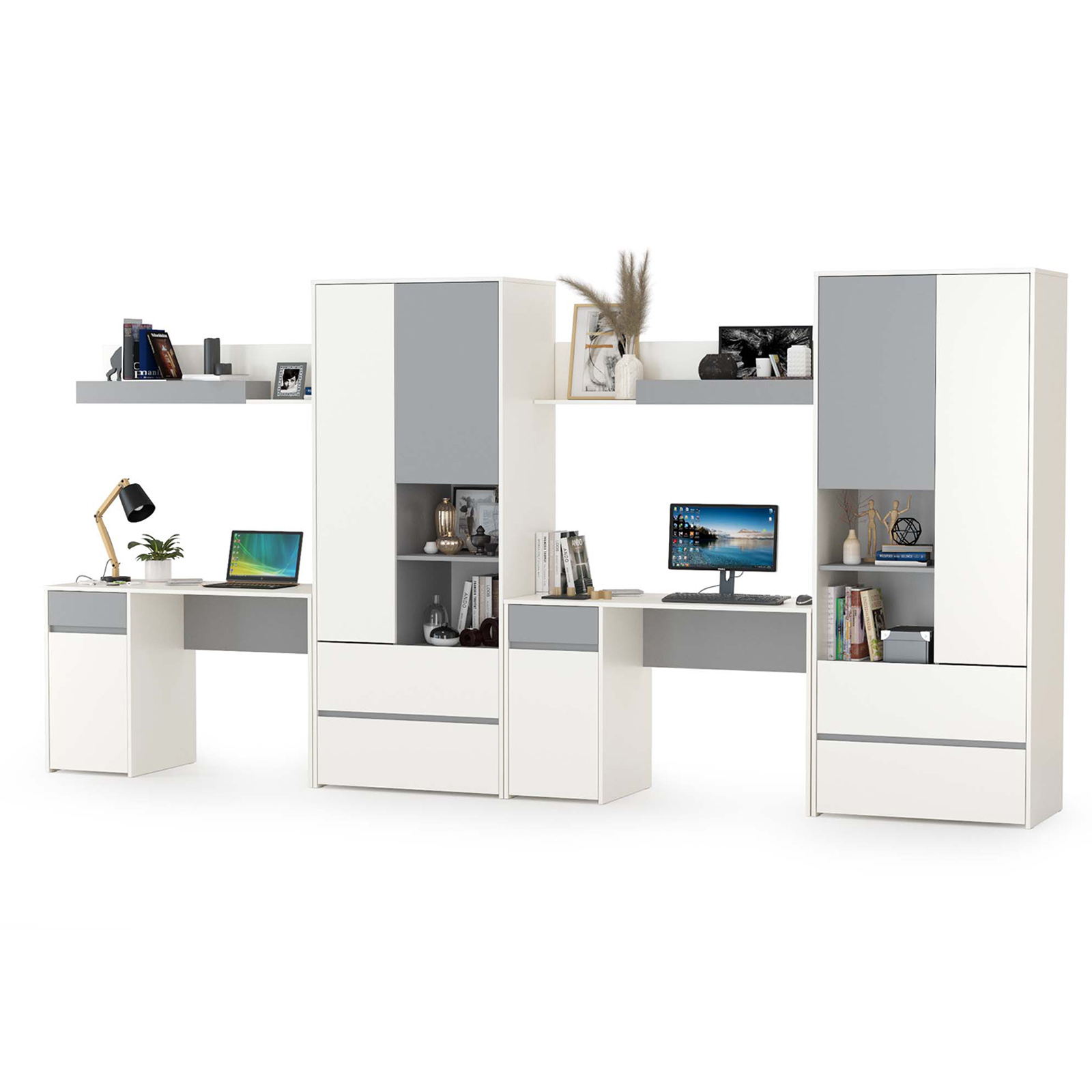 Комплектация состоит из двух шкафов для одежды и двух письменных столов с двумя открытыми полочками. Конструктивно каждый стол включает всестительную столешницу и тумбу под ней. Тумба каждого стола имеет удобное распашное отделение с полкой внутри и выдвижным ящиком над ним на шариковых направляющих полного выдвижения. Универсальная сборка - сторону расположения тумбы Вы определяете сами. Над каждым столом расположена полка, которая представляет из себя классическую открытую двухуровневую полку с задней панелью. Полка позволит разместить молодёжные аксессуары - знаковые мелочи, подчёркивающие индивидуальность подростка. Каждый шкаф оборудован горизонтальной штангой для одежды на плечиках за дверкой с одной стороны. С другой три полки, верхние две за распашной дверкой. В нижней части шкаф располагат двумя выдвижными ящиками на шариковых направляющих полного выдвижения обеспечивают длительную и тихую эксплуатацию. На внутренней стороне дверки отделения с штангой расположено зеркало. Шкаф для одежды Торонто 13.333 собирается на любую сторону, что позволяет расширить возможности по расстановке мебели. Распашные двери шкафа на четырёхшарнирных петлях без доводчиков. Отсутствие лицевой фурнитуры и открывание фасадов за край - не только стилевое, но функциональное решение. Так мебель занимает меньше места и дает возможность проходить вплотную с фасадом без риска зацепиться за ручку или травмироваться. Базовый белый цвет, сочетаясь с акцентным серым, создаёт нейтральную основу интерьера, чтобы подчеркнуть личные вещи и аксессуары. Корпуса и фасады мебели изготовлены из экологически чистой ламинированной ДСП 16 мм, торцы окромлены ПХВ плёнкой 0,4 мм. В производстве молодёжной Торонто использованы качественные материалы и фурнитура - можно разрабатывать проект на весь период обучения. Поставляется мебель в разобранном виде, надёжно упакованной в гофрокартон, с приложенной подробной инструкцией по сборке.