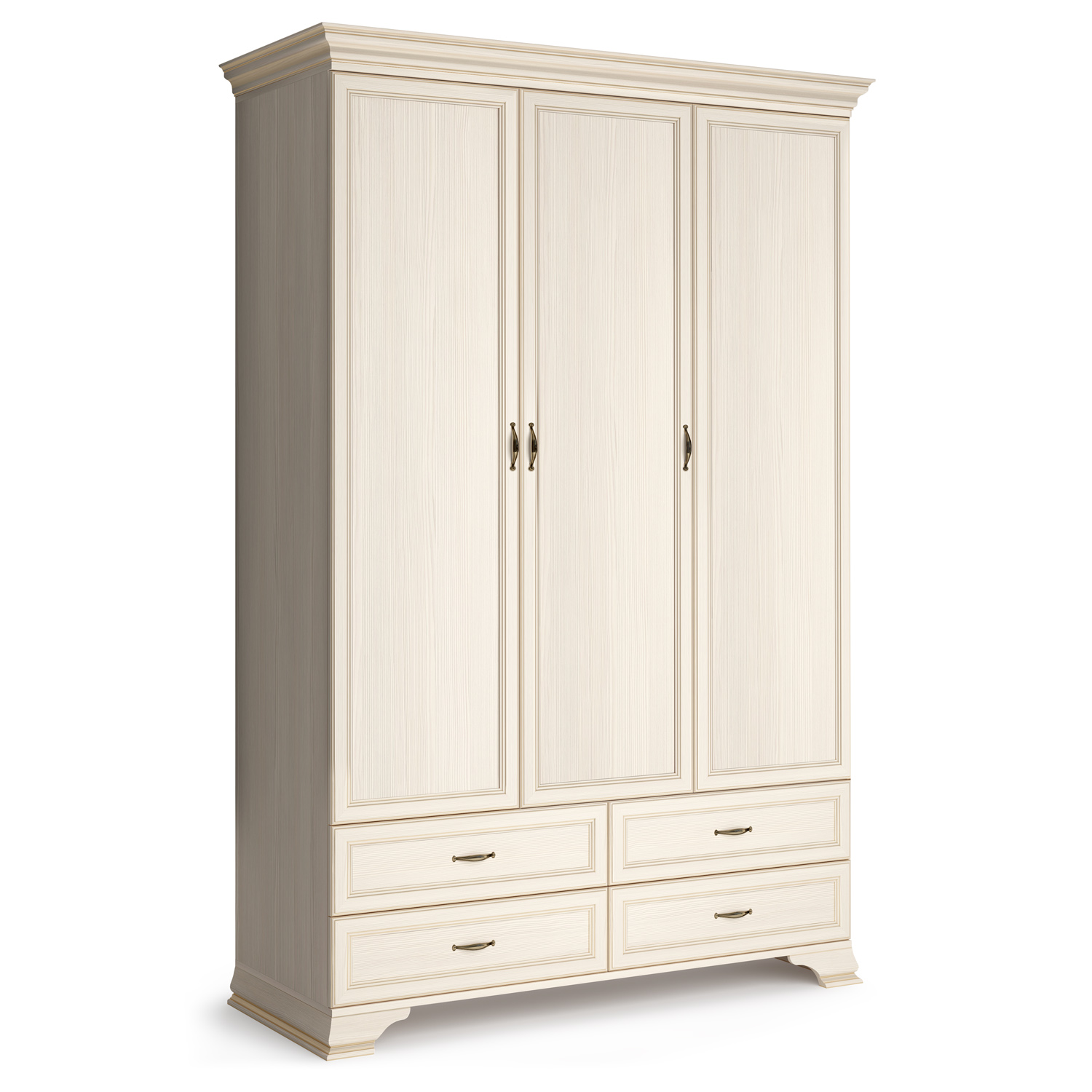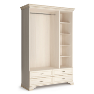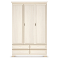 Шкаф распашной трехдверный предназначен для вертикального хранения одежды. Горизонтальная штанга для вешалок входит в комплект. Шкаф имеет 4 выдвижных ящика для хранения белья и разных мелочей.
