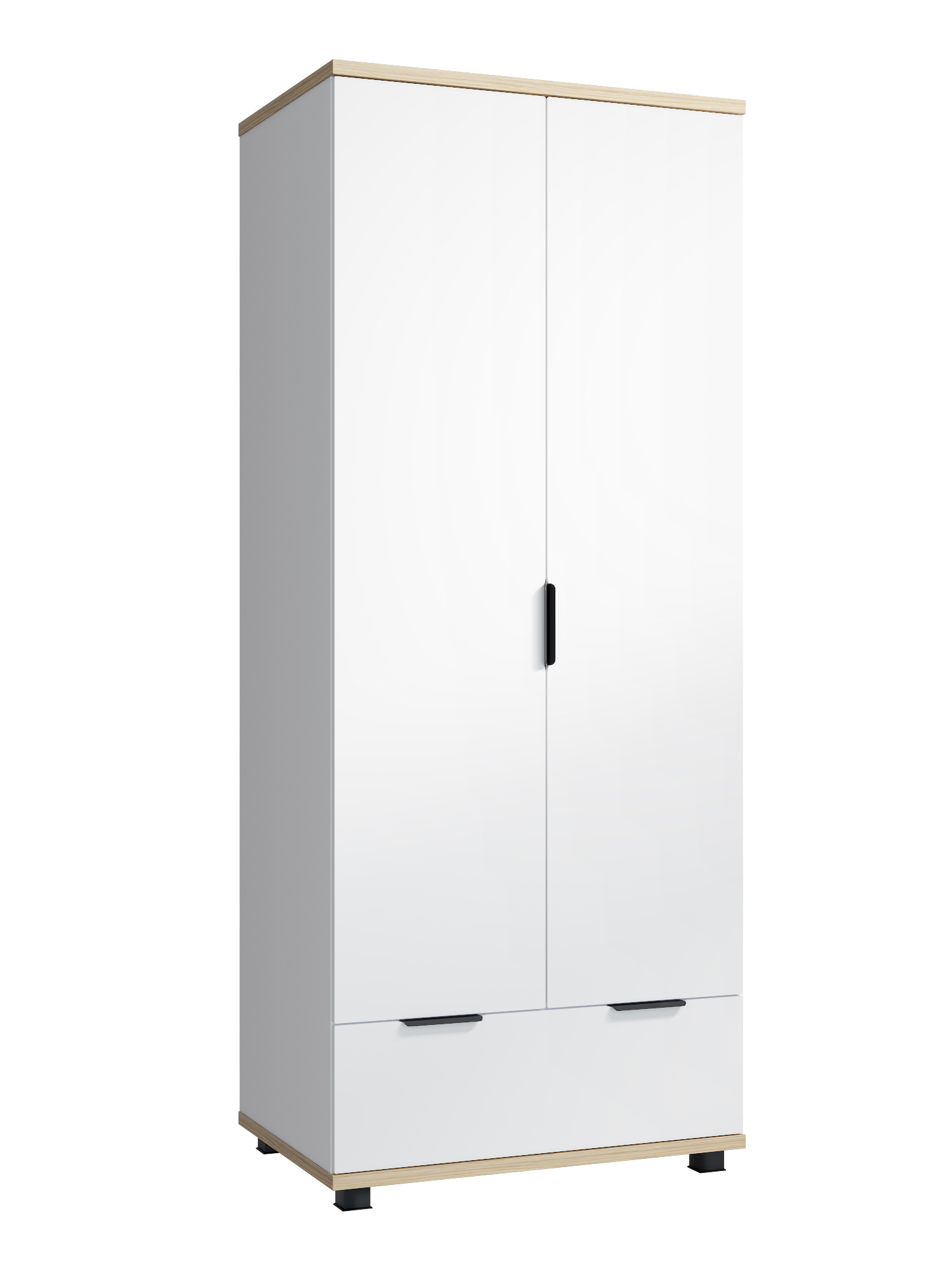 Корпус мебели изготовлен из ЛДСП 16 мм, крышка и дно шкафа из ЛДСП 25 мм, фасады из МДФ 16 мм. За распашными дверьми находится штанга для вешалок-плечиков и верхняя полка высотой 250 мм.