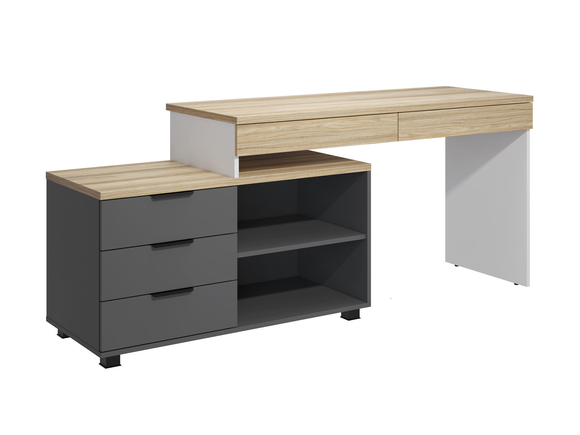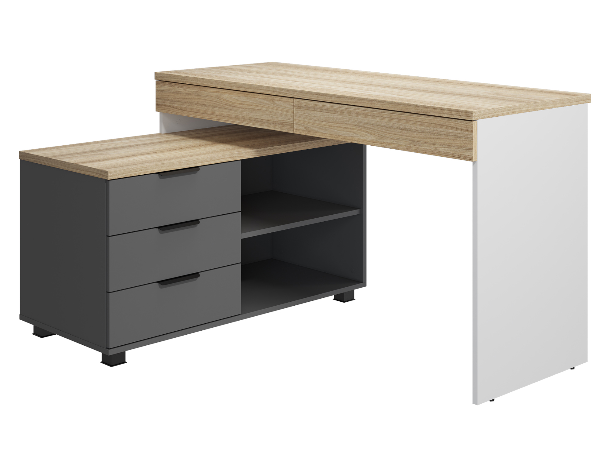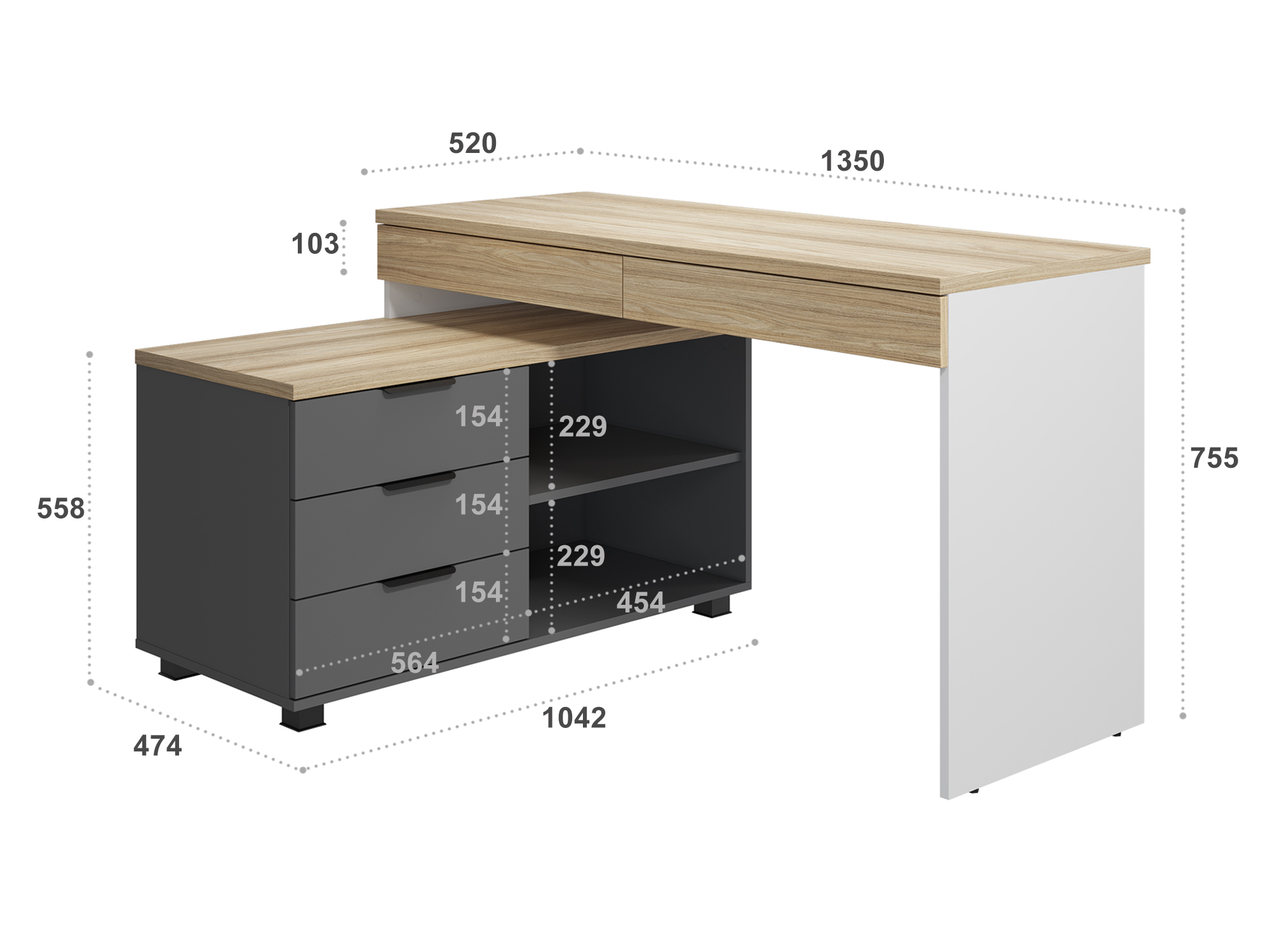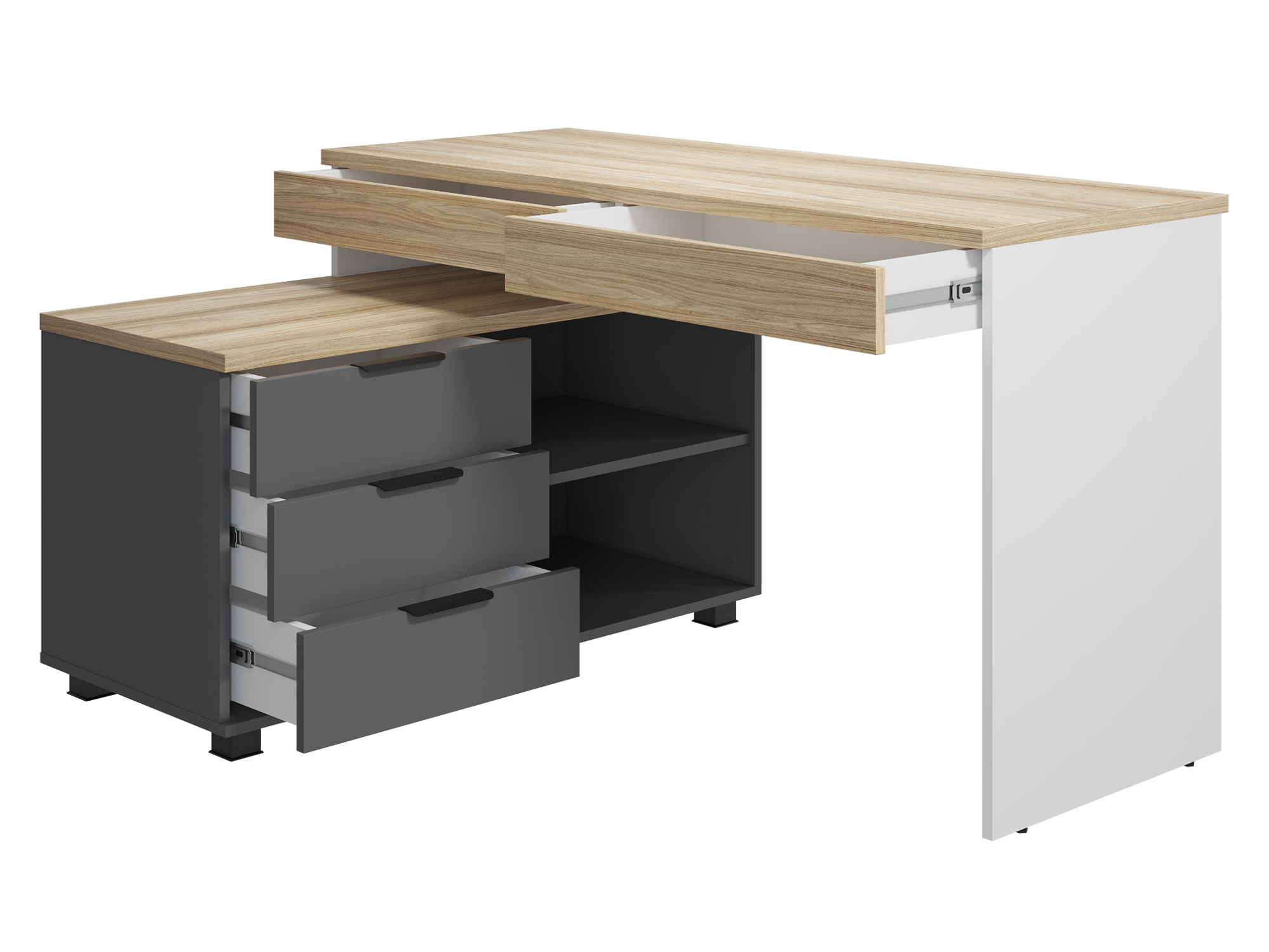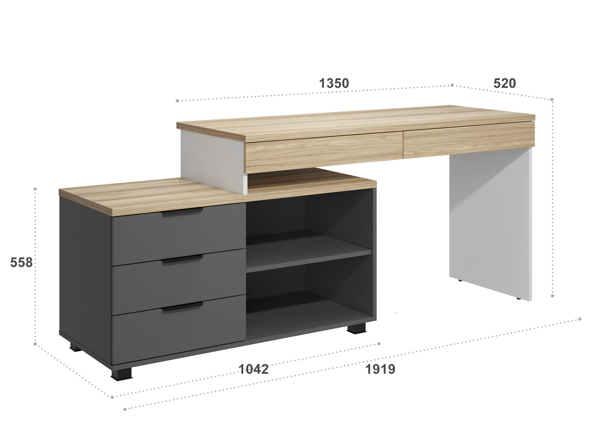 Стол угловой Скайлайт СЛ-21К станет отличной основой для создания комфортного рабочего пространства школьника или студента. Ширина столешницы 1350 мм позволит с комфортом заниматься учебой или творчеством. Габариты стола позволят разместить на нем ноутбук или компьютер с широкоформатным монитором и другие периферийные устройства. Два выдвижных ящика позволят удобно хранить канцелярские принадлежности. Они расположены под столешницей и имеют телескопические направляющие полного выдвижения без доводчиков. Частью стола является тумба с тремя выдвижными ящиками и двумя открытыми нишами для хранения. Письменный стол может быть собран как в угловом так и в прямом исполнении - для обоих вариантов в тумбе предусмотрены технологические отверстия.