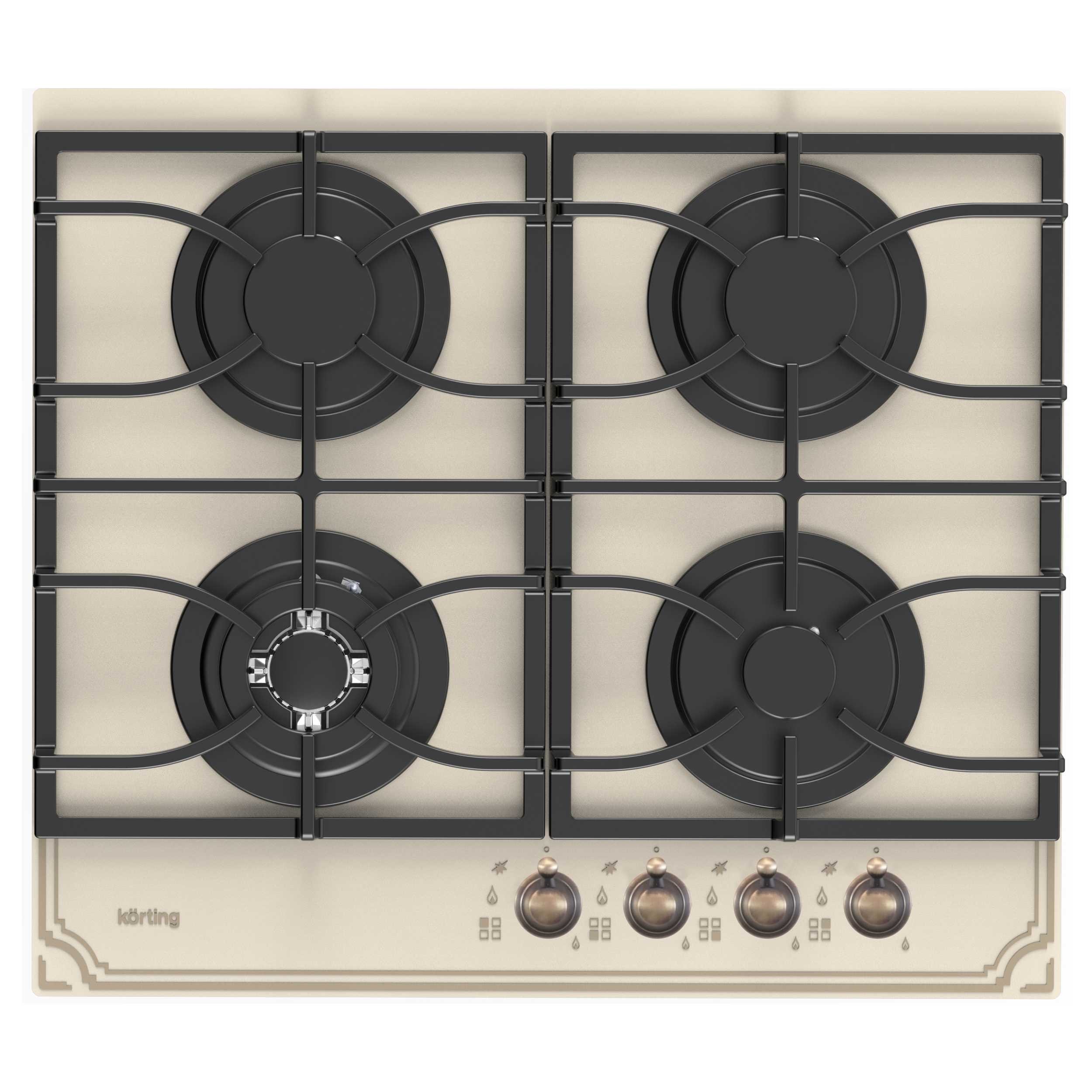 Газовая варочная панель из закаленного стекла 60 см, закаленное стекло, 4 высокоэффективные конфорки, WOK-сверхмощная конфорка с тройным рядом пламени, автоматический электроподжиг, газ-контроль каждой конфорки, переднее расположение поворотных регуляторов, цельные чугунные решетки, в комплекте - подставка WOK, цвет - бежевое стекло, цвет регуляторов - бронза.