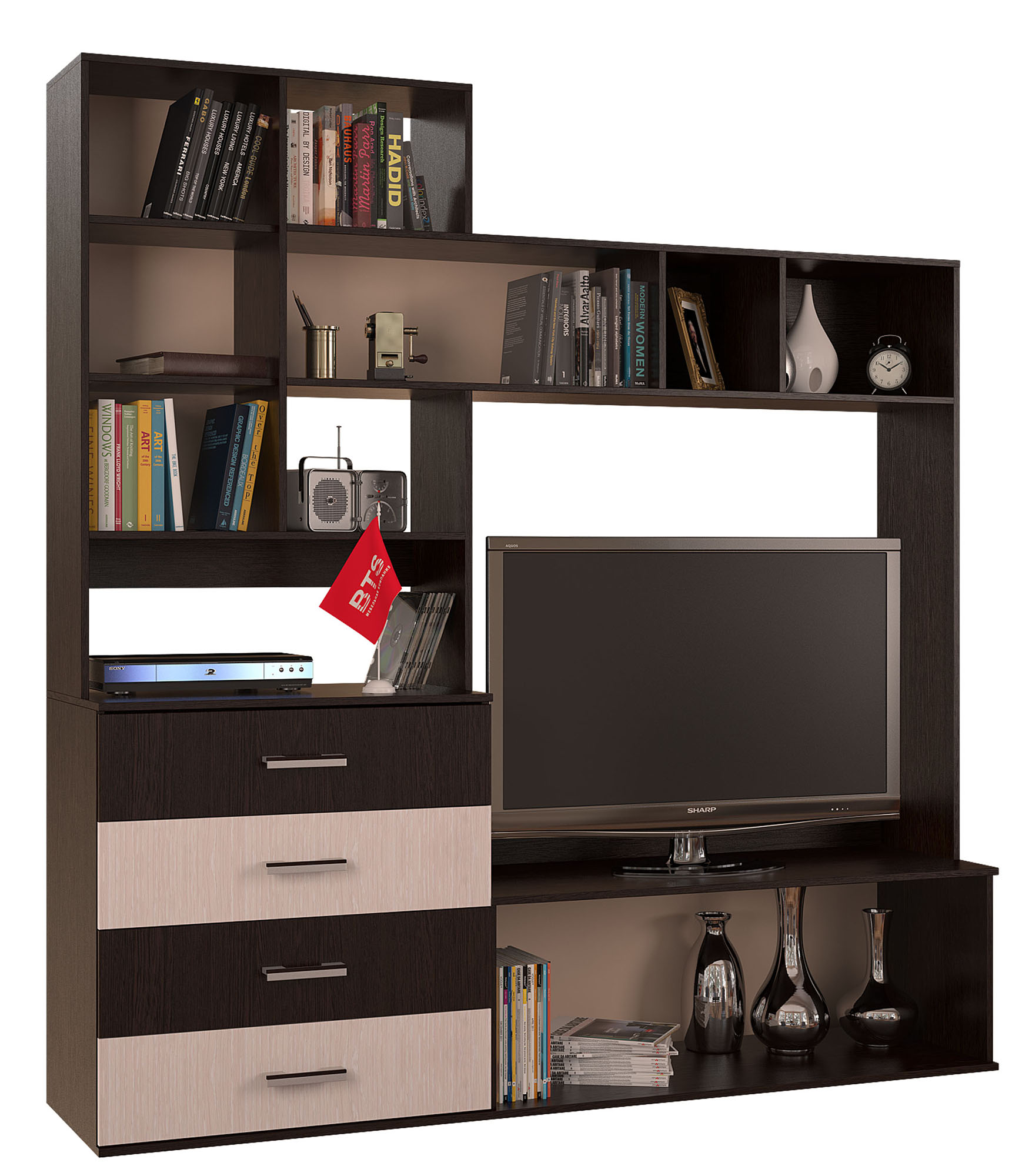 Тумба под ТВ, являющаяся центральной частью конструкции, специально разработана для установки современных телевизоров, благодаря своим габаритам (Ш х В х Г), мм: 1184 х 1024 х 454 мм. Это пространство предусмотрено для размещения телевизора среднего и крупного размера, что позволяет создать уютный уголок для отдыха и просмотра любимых фильмов и передач. Секция снабжена дополнительными отверстиями для проводов, которые помогут избежать путаницы и сохранить эстетический вид.