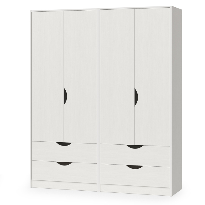 Конструктивно представляет собой два шкафа Уна 13.327 объединеных в единый блок. Шкаф за распашными дверками каждого шкафа оборудован отделением с антресольной полкой и штангой для одежды на вешалках. Снизу каждыйц шкаф для одежды дополнен двумя выдвижными ящиками на шариковых направляющих полного выдвижения, что значительно увеличивает функциональность изделия. Выдвижные ящики имеют внутренние перегородки для лучшей организации хранения. На дверях и выдвижных ящиках ручками служат вырезы в фасадах. Фасады выполнены в белом цвете с тиснением, структурой «Поры дерева». Выполнены из высококачественного ламинированного ДСП, толщиной 16 мм, с классом эмиссии Е1. Края обработаны кромкой ПВХ 0,4 и 2 мм. Поставляется в разобранном виде в надёжной упаковке, с комплектом фурнитуры и инструкцией по сборке. Сертификация на соответствие требованиям ГОСТ и санитарно-эпидемиологическим нормам подтверждена документально. Вы можете купить два детских шкафа для одежды Уна со скидкой при заказе через сайт в нашем магазине. Изображения двух детских шкафов для одежды Уна Вы можете найти выше в начале страницы.
