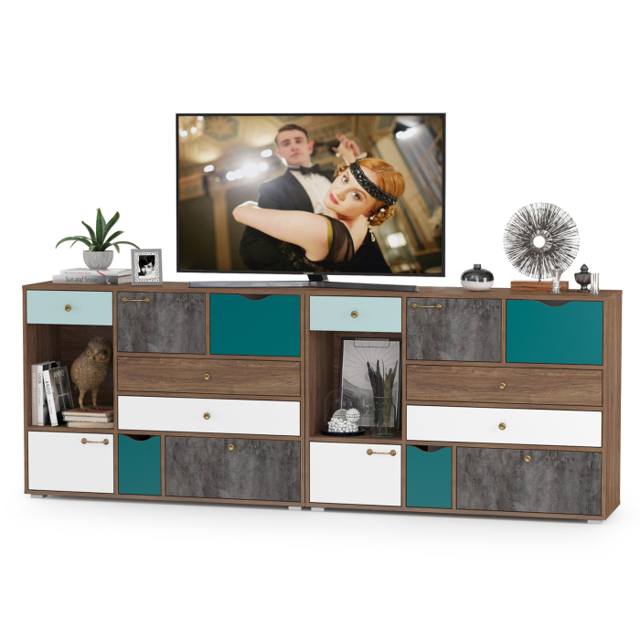 Две тумбы-комода Вайс - креативный подход к системе хранения. Эксклюзивные две тумбы-комода Вайс необычены всем - стильным калейдоскопом цветов, оригинальным дизайном и комбинацией элементов. Представляет собой два комода Вайс 10.104, которые можно разместить как единым блоком. так и по отдельности. Конструкция комода Вайс 10.104 включает два закрытых распашной дверкой отделения, открытую нишу и шесть выдвижных ящиков. Удобное расположение составляющих комод деталей, их различная форма и вместимость, помогают организовать идеальный порядок хранения. Пропорции тумб-комодов Вайс расчитаны для помещения любого размера - высокие, но узкие (всего 40см.) а также ещё и практичная подставка. В гостиной и детской - комод заменит тумбу под телевизор, в спальне и прихожей - крышка комода послужит отличным подзеркальником. Интересный микс цветов, занятная форма ручек эстетично украшают две тумбы-комоды Вайс, дают ему шансы занять достойное место в интерьере. Корпус и фасады выполнены из экологически чистой ламинированной ДСП 16 мм., торцы окромлены ПХВ плёнкой. Распашные двери на четырёхшарнирных петлях без доводчиков, выдвижные ящики - фолдинги на шариковых направляющих. Две тумбы-комода Вайс поставляются в разобранном виде, с комплектом фурнитуры, упакованный в 4-х слойный гофрокартон. Сертификация на соответствие требованиям ГОСТ и санитарно-эпидемиологическим нормам подтверждена документально. Вы можете купить две тумбы-комода Вайс со скидкой при заказе через сайт в нашем магазине. Изображения двух тумб-комодов Вайс Вы можете найти выше в начале страницы. Комод Вайс 10.104 - стиль и практичность!