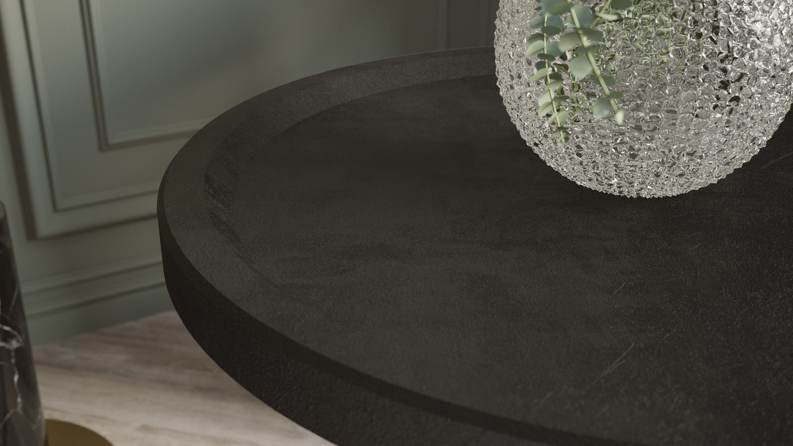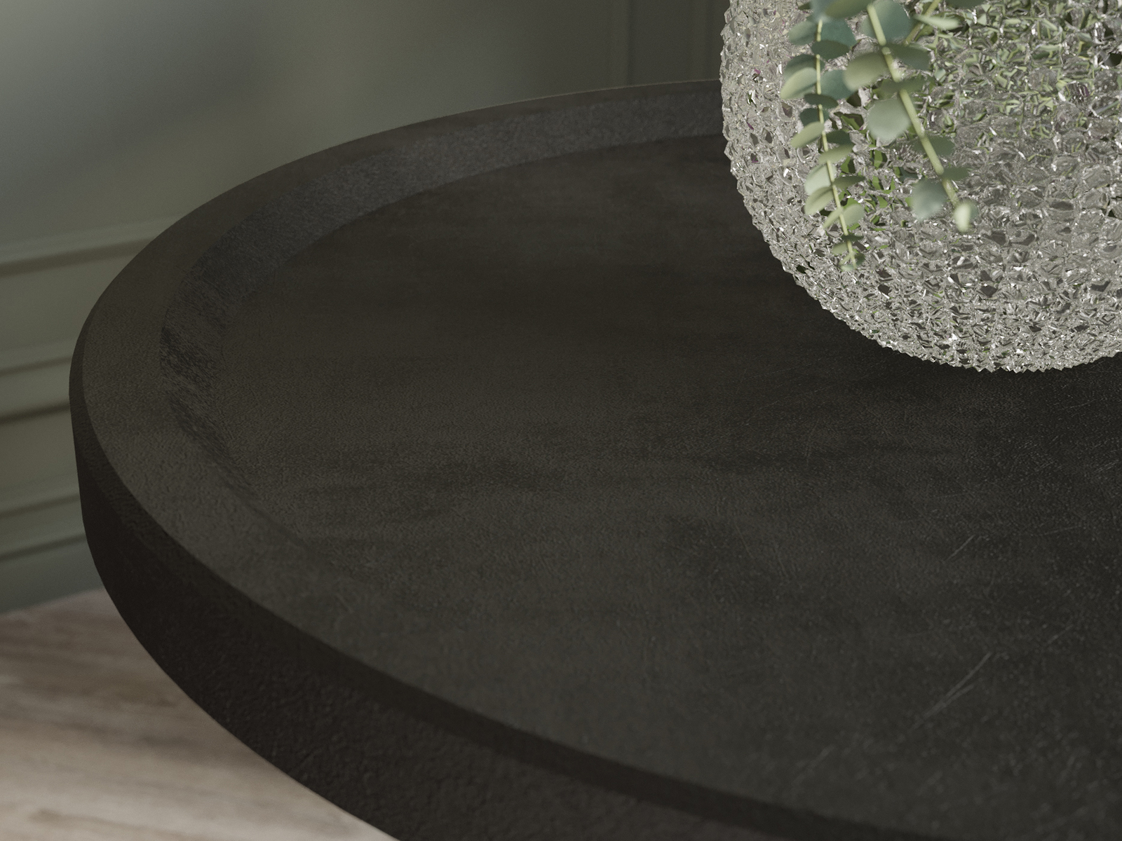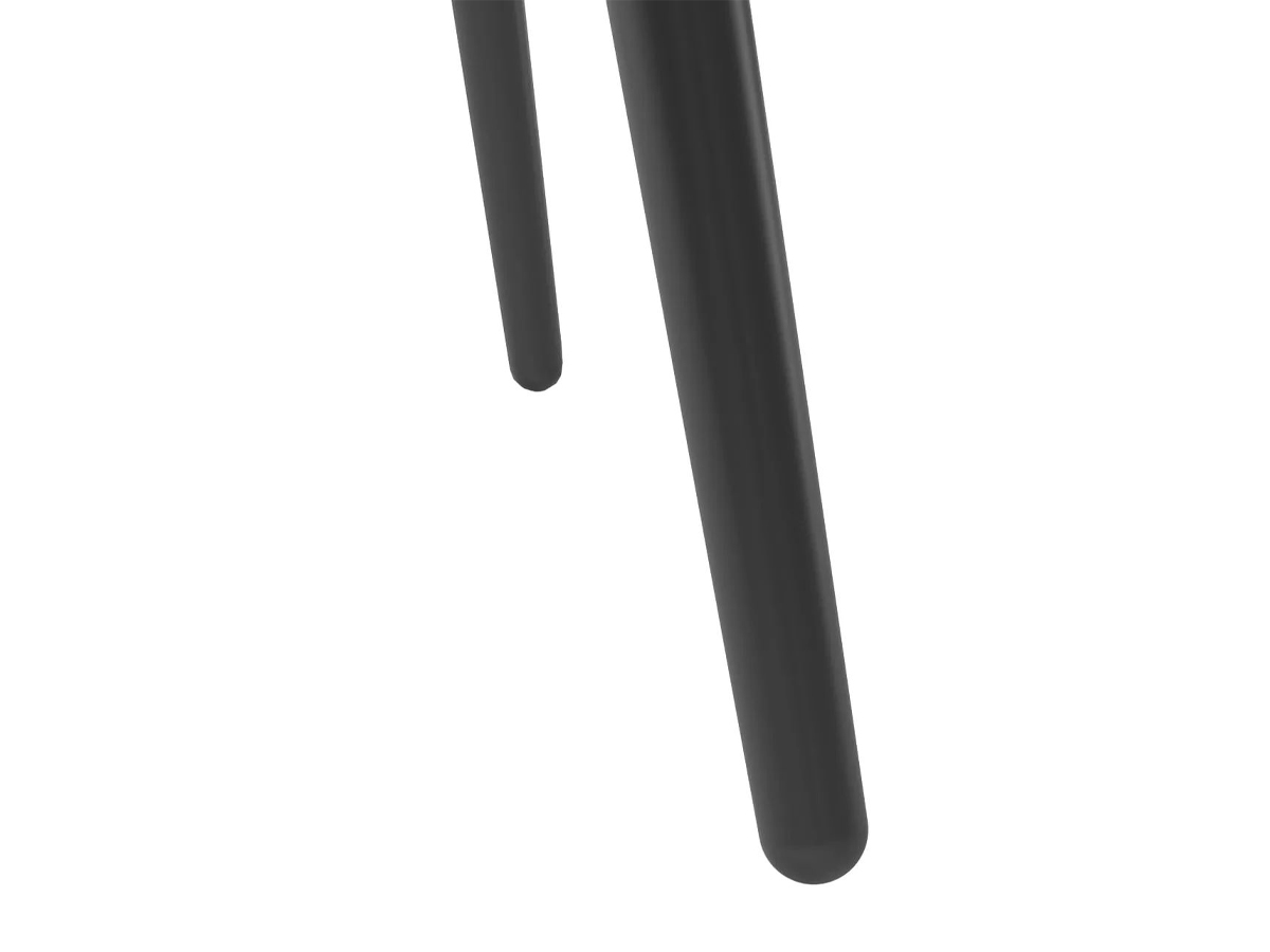 Круглая, слегка вогнутая столешница с оригинальным бортиком изготовлена из МДФ, лаконичный контраст которой придают изящные опоры из натурального дерева.