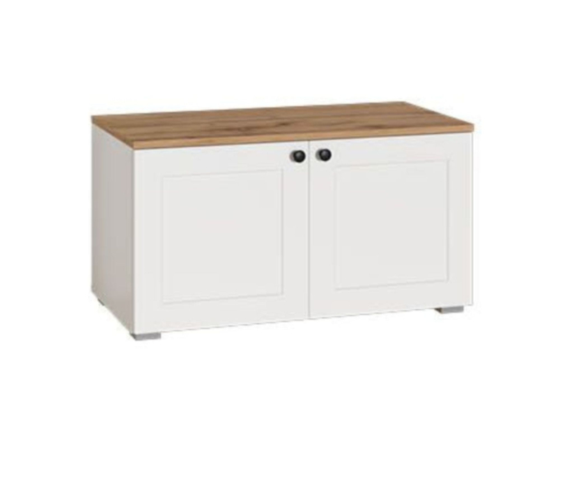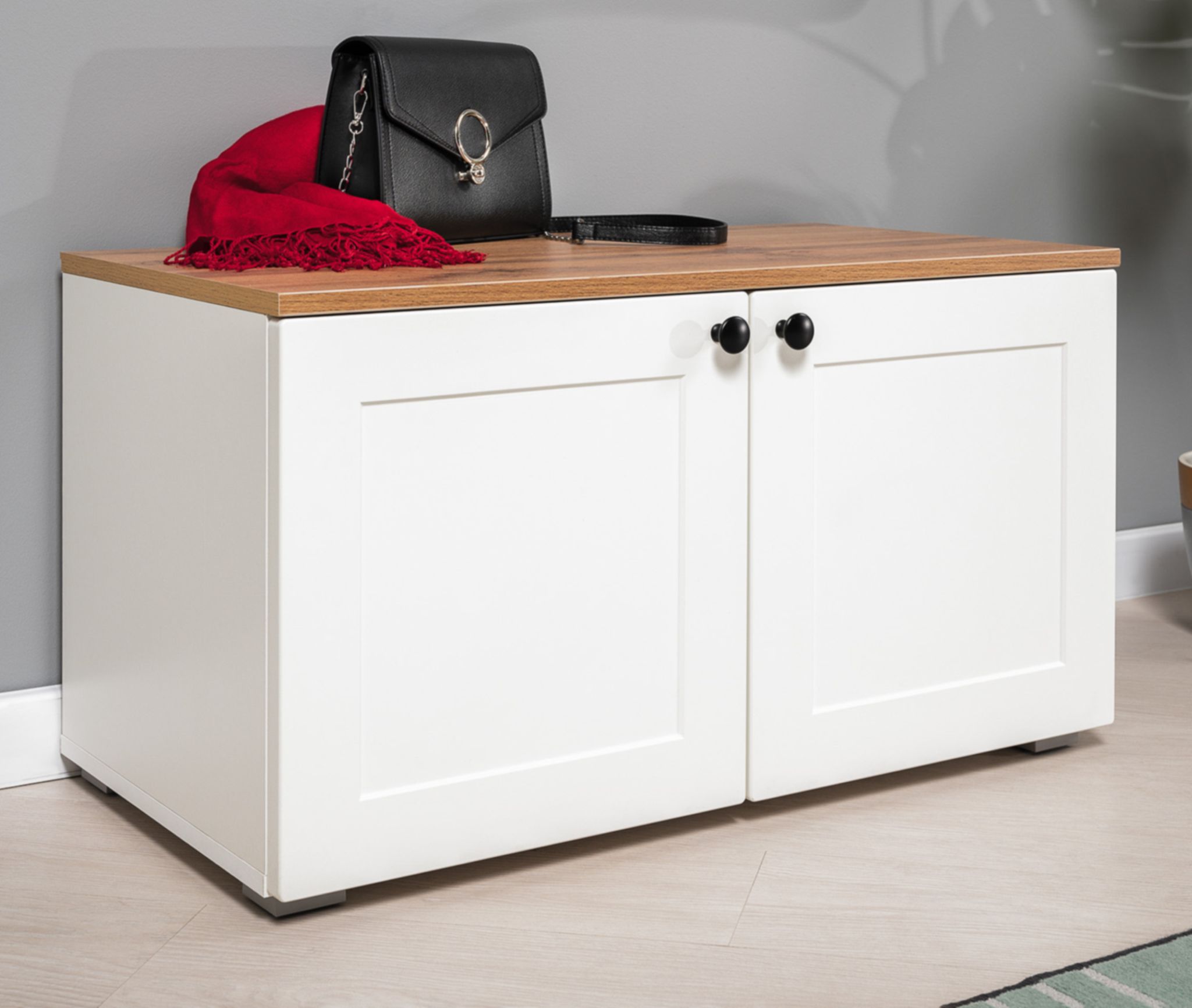 Остин Тумба 13.257 Белый шагрень/Дуб Золотой подойдет для хранения обуви или других предметов и одежды.