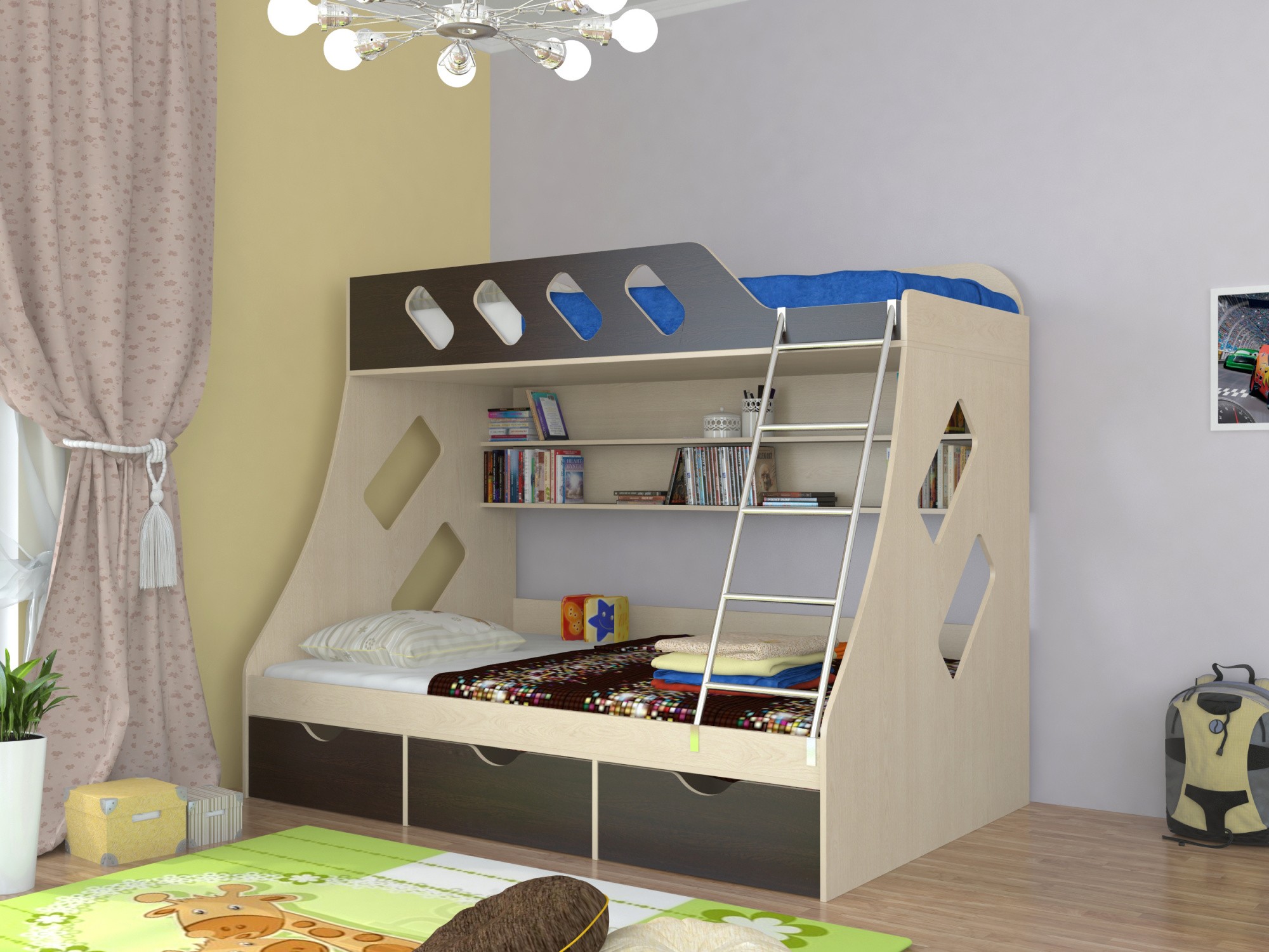 Кровать выполнена из высококачественного ЛДСП. Поэлементный набор дает возможность в одном стиле создать любой необходимый вариант для жилого помещения. Размер верхнего спального места 90*190, нижнего 120*190.