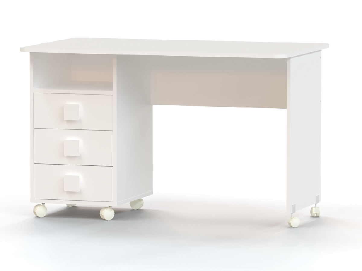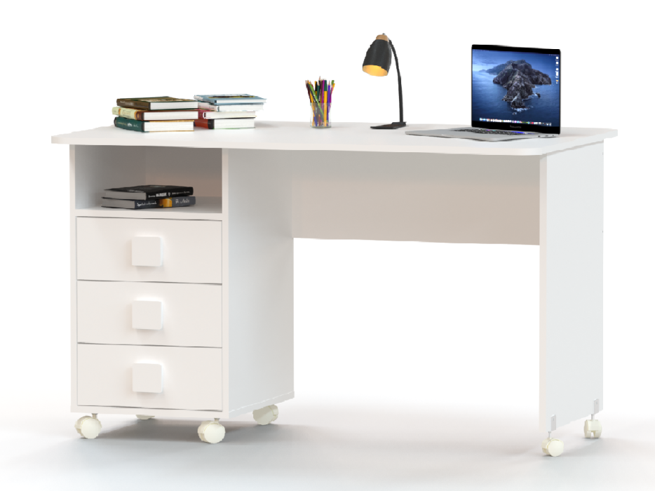 Три выкатных ящика стола обеспечат удобное хранение канцелярии, письменных, учебных и прочих принадлежностей. Над ящиками открытая полка для мелочей, которые будут всегда под рукой.