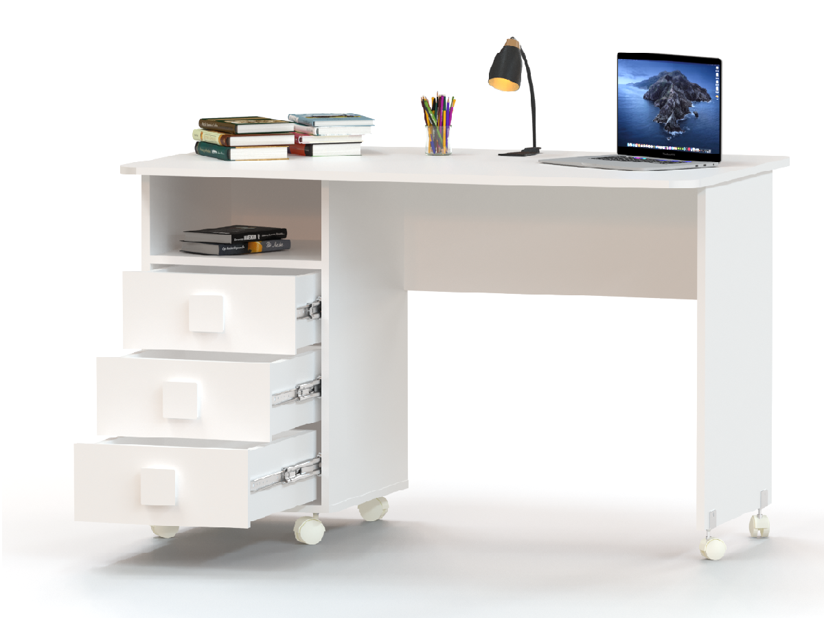 Комфортный письменный стол Легенда Л-03 белый оборудован поворотными колесами, легко перемещается по полу, задвигается и выдвигается.