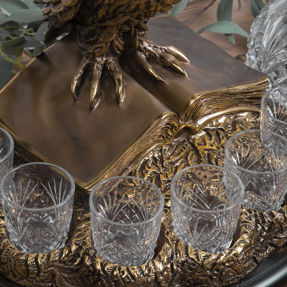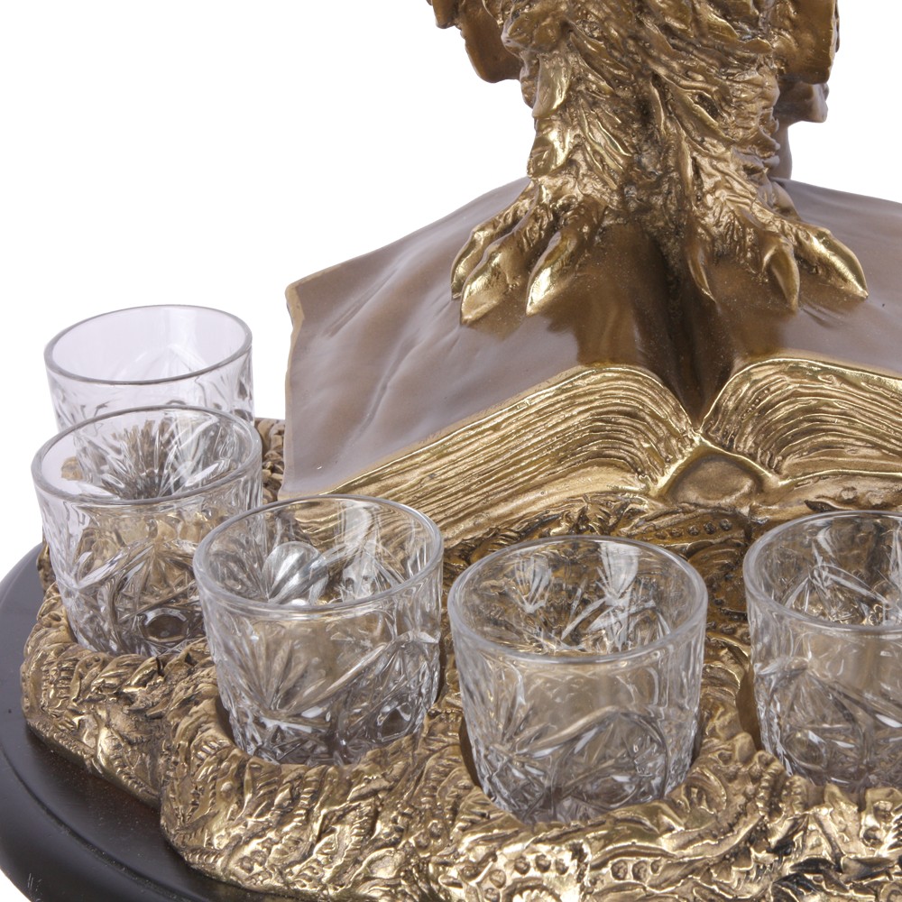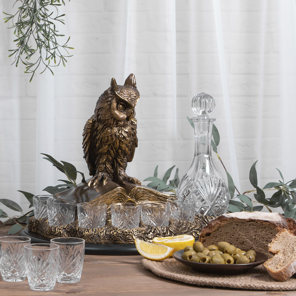 Питейный набор BOGACHO – это комплект стеклянных рюмок, графина, подставки и статуэтки.