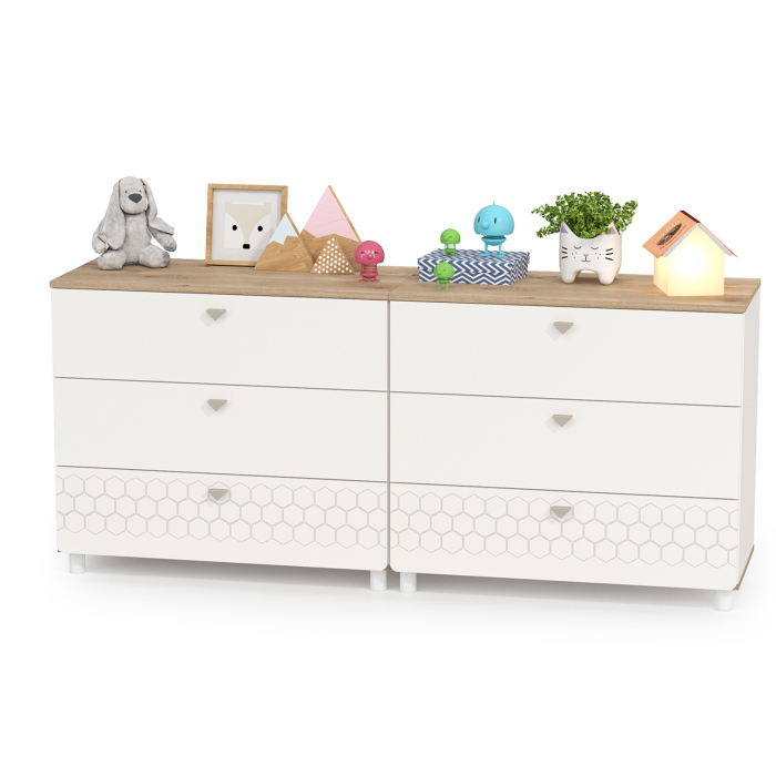 Cистема хранения комодов предствлена шестью выдвижными ящиками на шариковых направляющих полного выдвижения. Конструктивно это два комода Эйп 13.322 объединенных в единый блок. На фасаде скандинавские геометрические мотивы универсального цветового решения делают эту мебель подходящей и девочкам, и мальчикам. Опоры - регулируемые, что позволяет легко компенсировать неровности пола. Изготовлена мебель из экологически чистой ламинированной ДСП 16 мм, торцы окромлены ПХВ плёнкой. Толстая кромка — все выступающие части кровати закрыты прочной и безопасной кромкой толщиной 2 мм. Лицевая фурнитура - минималистичные пластиковые ручки. В производстве использованы качественные материалы и фурнитура - можно разрабатывать проект на весь период обучения. Выдвижные ящики на шариковых направляющих полного выдвижения обеспечивают длительную и тихую эксплуатацию. Поставляются в разобранном виде в надёжной упаковке, с комплектом сборочной фурнитуры и инструкцией по сборке.