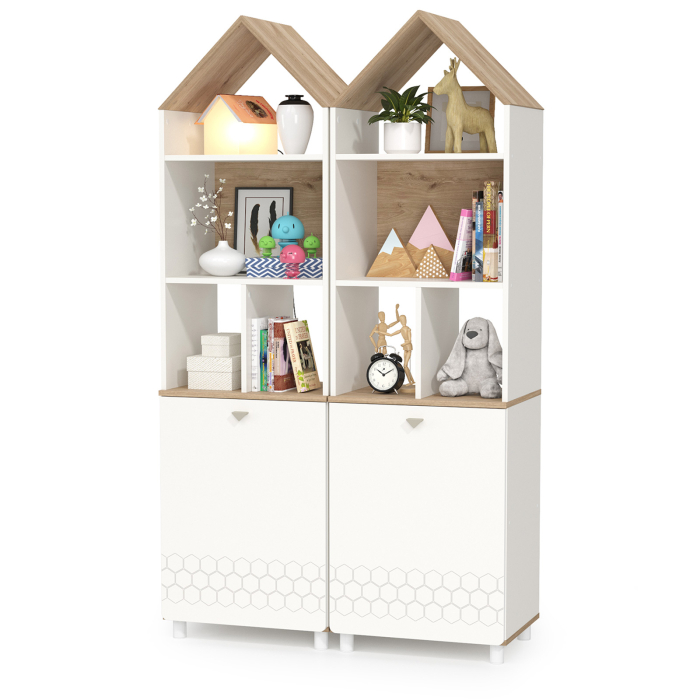 Конструктивно это два стеллажа Эйп 13.14 объединенных в единый блок. Каждый стеллаж представляет 5 ярусов, нижние два за распашной дверкой. Верхняя часть стеллажа выполнена в виде крыши домика, что несомненно будет радовать малыша. Дверь при сборке можно установить на любую сторону. На фасаде скандинавские геометрические мотивы универсального цветового решения делают эту мебель подходящей и девочкам, и мальчикам. Опоры - регулируемые, что позволяет легко компенсировать неровности пола. Изготовлена мебель из экологически чистой ламинированной ДСП 16 мм, торцы окромлены ПХВ плёнкой. Толстая кромка — все выступающие части кровати закрыты прочной и безопасной кромкой толщиной 2 мм. Лицевая фурнитура - минималистичные пластиковые ручки. В производстве использованы качественные материалы и фурнитура - можно разрабатывать проект на весь период обучения. Распашные двери на четырёхшарнирных петлях без доводчиков. Поставляется в разобранном виде в надёжной упаковке, с комплектом сборочной фурнитуры и инструкцией по сборке.