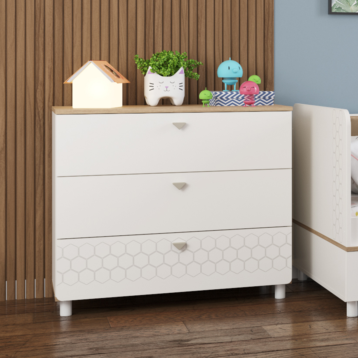 Односпальная кровать Эйп оснащена съёмным мягким элементом с карманами — можно легко снять для стирки. Съёмный бортик на кроватке — это надежная защита от беспокойного сна Вашего малыша. Оригинальная фотопечать - мультяшные пчёлки, которые никого не оставят равнодушным. Спальное место 800х1600 мм., основание под матрас в комплекте (настил ЛДСП). Матрас для этой кровати приобретается отдельно. Рекомендуемая высота матраса 120 мм. В основании кроватки размещены - три выкатных ящика для постельных принадлежностей и личных вещей ребёнка. На фасаде скандинавские геометрические мотивы универсального цветового решения делают эту мебель подходящей и девочкам, и мальчикам. Опоры - регулируемые, что позволяет легко компенсировать неровности пола. Изготовлена мебель из экологически чистой ламинированной ДСП 16 мм, торцы окромлены ПХВ плёнкой. Толстая кромка — все выступающие части кровати закрыты прочной и безопасной кромкой толщиной 2 мм. Лицевая фурнитура - минималистичные пластиковые ручки. В производстве использованы качественные материалы и фурнитура - можно разрабатывать проект на весь период обучения. Выдвижные ящики на шариковых направляющих полного выдвижения обеспечивают длительную и тихую эксплуатацию. Распашные двери на четырёхшарнирных петлях без доводчиков. Поставляется в разобранном виде в надёжной упаковке, с комплектом сборочной фурнитуры и инструкцией по сборке.