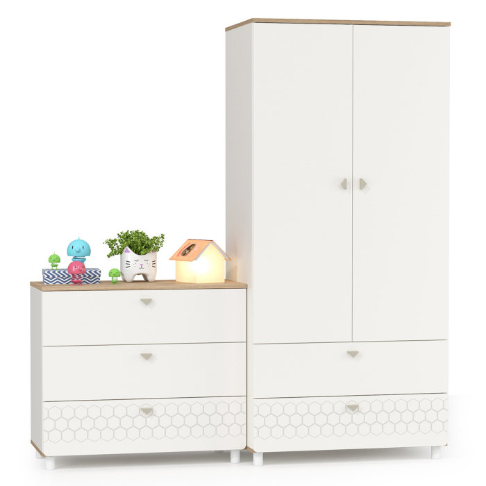 За распашными дверками шкафа расположено отделение со штангой для одежды на плечиках и отделение с тремя полка. В нижней части расположено два выдвижных ящика на шариковых направляющих полного выдвижения, что значительно повышает функционал. Cистема хранения комода предствлена тремя выдвижными ящиками на шариковых направляющих полного выдвижения. На фасаде скандинавские геометрические мотивы универсального цветового решения делают эту мебель подходящей и девочкам, и мальчикам. Опоры - регулируемые, что позволяет легко компенсировать неровности пола. Изготовлена мебель из экологически чистой ламинированной ДСП 16 мм, торцы окромлены ПХВ плёнкой. Толстая кромка — все выступающие части кровати закрыты прочной и безопасной кромкой толщиной 2 мм. Лицевая фурнитура - минималистичные пластиковые ручки. В производстве использованы качественные материалы и фурнитура - можно разрабатывать проект на весь период обучения. Выдвижные ящики на шариковых направляющих полного выдвижения обеспечивают длительную и тихую эксплуатацию. Распашные двери на четырёхшарнирных петлях без доводчиков. Поставляется в разобранном виде в надёжной упаковке, с комплектом сборочной фурнитуры и инструкцией по сборке.