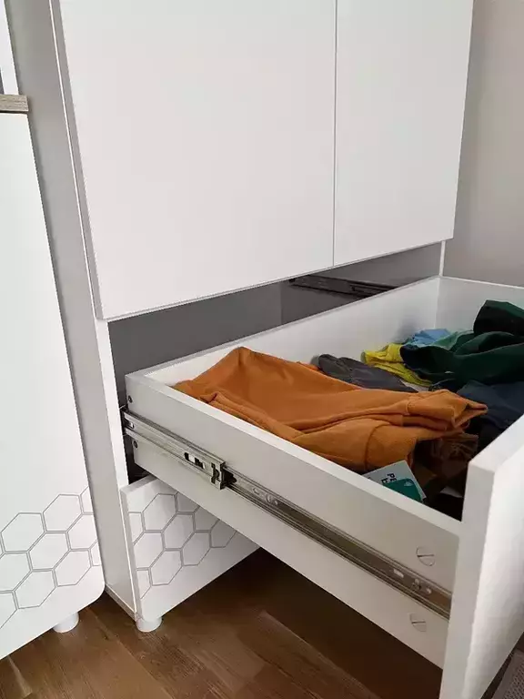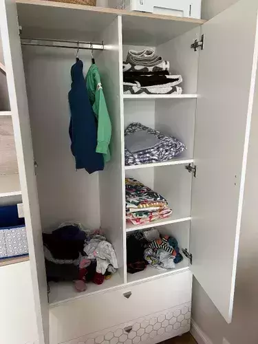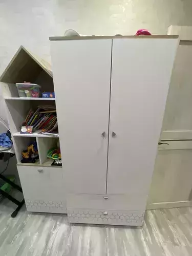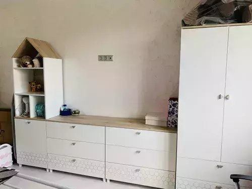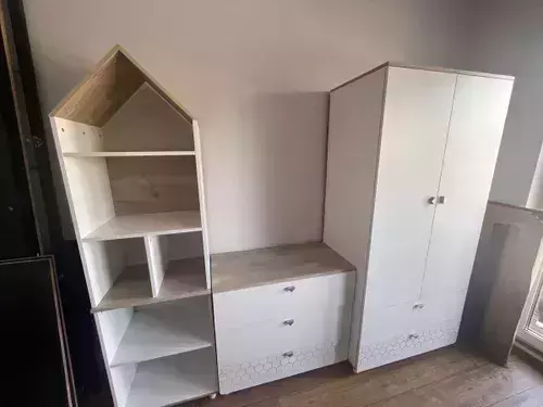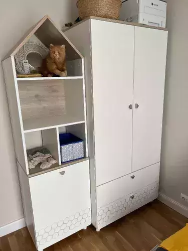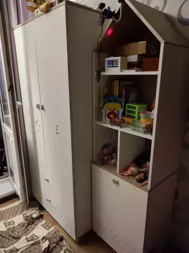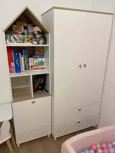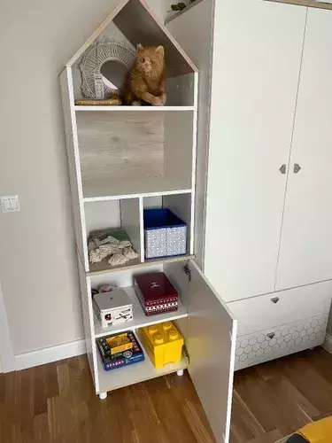 Стеллаж конструктивно представляет 5 ярусов, нижние два за распашной дверкой. Верхняя часть стеллажа выполнена в виде крыши домика, что несомненно будет радовать малыша. Дверь при сборке можно установить на любую сторону. За распашными дверками шкафа расположено отделение со штангой для одежды на плечиках и отделение с тремя полка. В нижней части расположено два выдвижных ящика на шариковых направляющих полного выдвижения, что значительно повышает функционал. На фасаде скандинавские геометрические мотивы универсального цветового решения делают эту мебель подходящей и девочкам, и мальчикам. Опоры - регулируемые, что позволяет легко компенсировать неровности пола. Изготовлена мебель из экологически чистой ламинированной ДСП 16 мм, торцы окромлены ПХВ плёнкой. Толстая кромка — все выступающие части кровати закрыты прочной и безопасной кромкой толщиной 2 мм. Лицевая фурнитура - минималистичные пластиковые ручки. В производстве использованы качественные материалы и фурнитура - можно разрабатывать проект на весь период обучения. Выдвижные ящики на шариковых направляющих полного выдвижения обеспечивают длительную и тихую эксплуатацию. Распашные двери на четырёхшарнирных петлях без доводчиков. Поставляется в разобранном виде в надёжной упаковке, с комплектом сборочной фурнитуры и инструкцией по сборке.