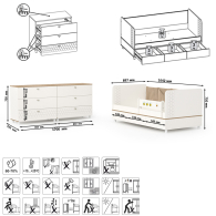 Односпальная кровать Эйп оснащена съёмным мягким элементом с карманами — можно легко снять для стирки. Съёмный бортик на кроватке — это надежная защита от беспокойного сна Вашего малыша. Оригинальная фотопечать - мультяшные пчёлки, которые никого не оставят равнодушным. Спальное место 800х1600 мм., основание под матрас в комплекте (настил ЛДСП). Матрас для этой кровати приобретается отдельно. Рекомендуемая высота матраса 120 мм. В основании кроватки размещены - три выкатных ящика для постельных принадлежностей и личных вещей ребёнка. Cистема хранения комодов предствлена шестью выдвижными ящиками на шариковых направляющих полного выдвижения. Конструктивно это два комода Эйп 13.322 объединенных в единый блок. На фасаде скандинавские геометрические мотивы универсального цветового решения делают эту мебель подходящей и девочкам, и мальчикам. Опоры - регулируемые, что позволяет легко компенсировать неровности пола. Изготовлена мебель из экологически чистой ламинированной ДСП 16 мм, торцы окромлены ПХВ плёнкой. Толстая кромка — все выступающие части кровати закрыты прочной и безопасной кромкой толщиной 2 мм. Лицевая фурнитура - минималистичные пластиковые ручки. В производстве использованы качественные материалы и фурнитура - можно разрабатывать проект на весь период обучения. Выдвижные ящики на шариковых направляющих полного выдвижения обеспечивают длительную и тихую эксплуатацию. Распашные двери на четырёхшарнирных петлях без доводчиков. Поставляется в разобранном виде в надёжной упаковке, с комплектом сборочной фурнитуры и инструкцией по сборке. Изображения кровати в детскую Эйп с комодами на три ящика Вы можете найти выше в начале страницы.