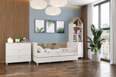 Мебель в детскую Эйп № 3 состоит из кроватки, стеллажа и комода. Односпальная кровать Эйп оснащена съёмным мягким элементом с карманами — можно легко снять для стирки. Съёмный бортик на кроватке — это надежная защита от беспокойного сна Вашего малыша. Оригинальная фотопечать - мультяшные пчёлки, которые никого не оставят равнодушным. Спальное место 800х1600 мм., основание под матрас в комплекте (настил ЛДСП). Матрас для этой кровати приобретается отдельно. Рекомендуемая высота матраса 120 мм. В основании кроватки размещены - три выкатных ящика для постельных принадлежностей и личных вещей ребёнка. Стеллаж конструктивно представляет 5 ярусов, нижние два за распашной дверкой. Верхняя часть стеллажа выполнена в виде крыши домика, что несомненно будет радовать малыша. Дверь при сборке можно установить на любую сторону. Cистема хранения комода предствлена тремя выдвижными ящиками на шариковых направляющих полного выдвижения. На фасаде скандинавские геометрические мотивы универсального цветового решения делают эту мебель подходящей и девочкам, и мальчикам. Опоры - регулируемые, что позволяет легко компенсировать неровности пола. Изготовлена мебель из экологически чистой ламинированной ДСП 16 мм, торцы окромлены ПХВ плёнкой. Толстая кромка — все выступающие части кровати закрыты прочной и безопасной кромкой толщиной 2 мм. Лицевая фурнитура - минималистичные пластиковые ручки. В производстве использованы качественные материалы и фурнитура - можно разрабатывать проект на весь период обучения. Выдвижные ящики на шариковых направляющих полного выдвижения обеспечивают длительную и тихую эксплуатацию. Распашные двери на четырёхшарнирных петлях без доводчиков. Поставляется в разобранном виде в надёжной упаковке, с комплектом сборочной фурнитуры и инструкцией по сборке. Изображения мебели в детскую Эйп № 3 Вы можете найти выше в начале страницы.