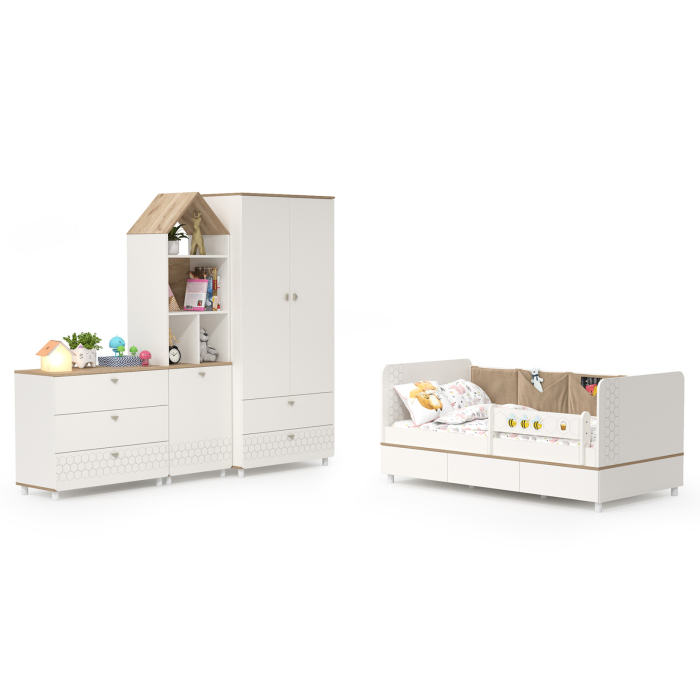 Мебель для детской комнаты Эйп № 1 состоит из кроватки, шкафа для одежды, стеллажа и комода. Односпальная кровать Эйп оснащена съёмным мягким элементом с карманами — можно легко снять для стирки. Съёмный бортик на кроватке — это надежная защита от беспокойного сна Вашего малыша. Оригинальная фотопечать - мультяшные пчёлки, которые никого не оставят равнодушным. Спальное место 800х1600 мм., основание под матрас в комплекте (настил ЛДСП). Матрас для этой кровати приобретается отдельно. Рекомендуемая высота матраса 120 мм. В основании кроватки размещены - три выкатных ящика для постельных принадлежностей и личных вещей ребёнка. За распашными дверками шкафа расположено отделение со штангой для одежды на плечиках и отделение с тремя полка. В нижней части расположено два выдвижных ящика на шариковых направляющих полного выдвижения, что значительно повышает функционал. Стеллаж конструктивно представляет 5 ярусов, нижние два за распашной дверкой. Верхняя часть стеллажа выполнена в виде крыши домика, что несомненно будет радовать малыша. Дверь при сборке можно установить на любую сторону. Cистема хранения комода предствлена тремя выдвижными ящиками на шариковых направляющих полного выдвижения. На фасаде скандинавские геометрические мотивы универсального цветового решения делают эту мебель подходящей и девочкам, и мальчикам. Опоры - регулируемые, что позволяет легко компенсировать неровности пола. Изготовлена мебель из экологически чистой ламинированной ДСП 16 мм, торцы окромлены ПХВ плёнкой. Толстая кромка — все выступающие части кровати закрыты прочной и безопасной кромкой толщиной 2 мм. Лицевая фурнитура - минималистичные пластиковые ручки. В производстве использованы качественные материалы и фурнитура - можно разрабатывать проект на весь период обучения. Выдвижные ящики на шариковых направляющих полного выдвижения обеспечивают длительную и тихую эксплуатацию. Распашные двери на четырёхшарнирных петлях без доводчиков. Поставляется в разобранном виде в надёжной упаковке, с комплектом сборочной фурнитуры и инструкцией по сборке. Изображения мебели для детской комнаты Эйп № 1 Вы можете найти выше в начале страницы.