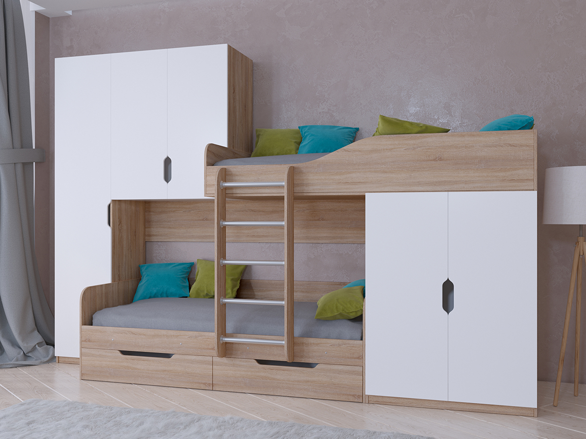 Двухъярусная кровать Лео представляет из себя полноценный комплект для детской комнаты. Два полноценных спальных места помогут хорошо выспаться и набраться сил. Удобный доступ к верхнему ярусу обеспечивается за счет надежной лестницы с металлическими ступенями. Развитая система хранения вещей данной кровати позволит разместить в своих недрах все необходимые вещи. Постельное белье с легкостью поместиться в ящики, расположенные под нижним ярусом. Так же кровать располагает платяным шкафом, высокой колонкой с полками и вместительной антресолью.