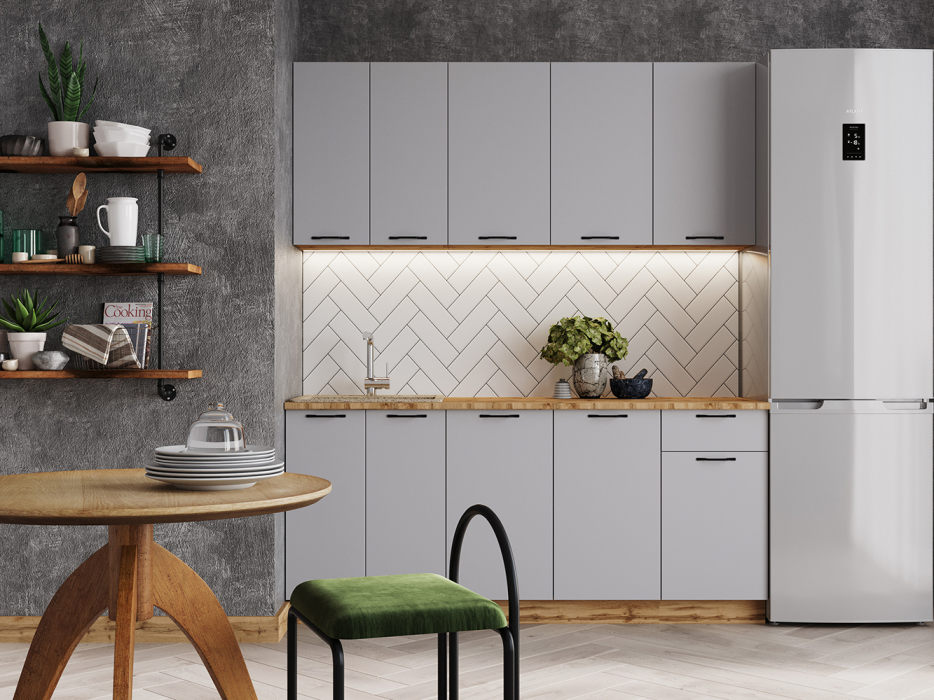 Идеально выверенная геометрия, отсутствие лишних элементов декора, невероятная чёткость линий и стиль, о котором вы всегда мечтали. Гарнитур «Вивиан МДФ 1,8 м 38 мм» станет ключевым объектом на вашей кухне, привлекающим внимание с первых минут. Главное преимущество модели заключается в отсутствии эффекта загромождения при наличии достаточного количество полок для хранения кухонной утвари и аксессуаров. Благородное сочетание дуб вотан/серый матовый станет символом хорошего вкуса и практичности, а дуб вотан/белый матовый продемонстрирует решительность и неподдельное стремление к совершенству. Стеновая панель, мойка, смеситель не входят в стоимость комплекта. Состав компоновки В600, В800, В400, М600 Н800, Н401 Глубина нижних модулей со столешницей: 600мм; Глубина нижних модулей без столешницы: 458мм; Высота нижних модулей: 816мм; Высота верхних модулей: 716мм. Глубина верхних модулей: 318мм. Столешница цельная, цвет вотан.
