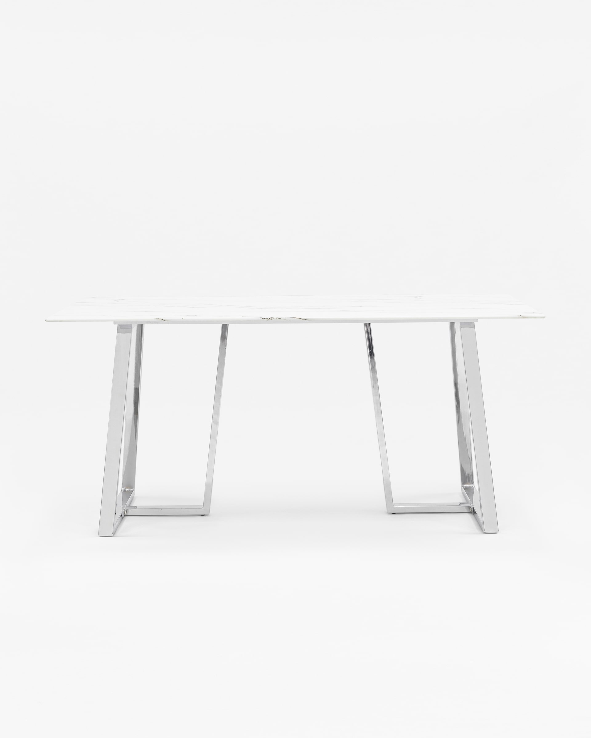 Обеденный стол с красивой стеклянной столешницей белого цвета с рисунком под мрамор.