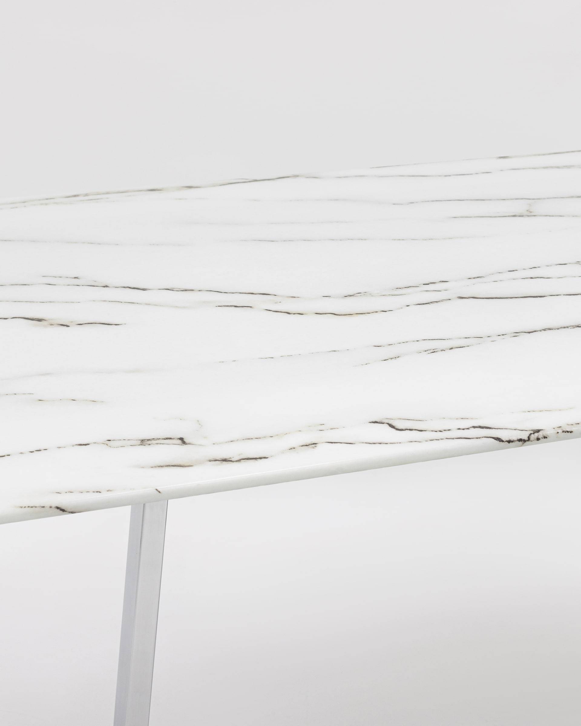 Красивая столешница гармонирует с металлическими ножками оригинальной формы.
