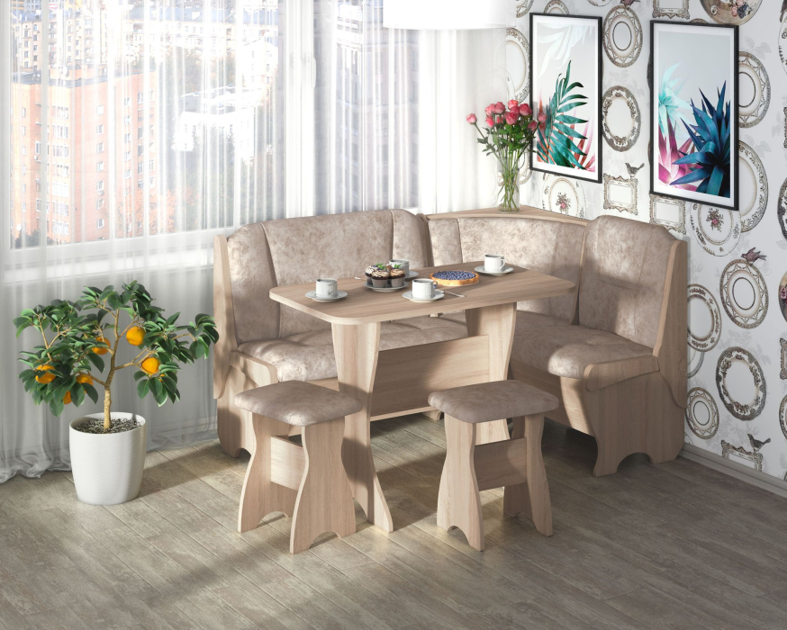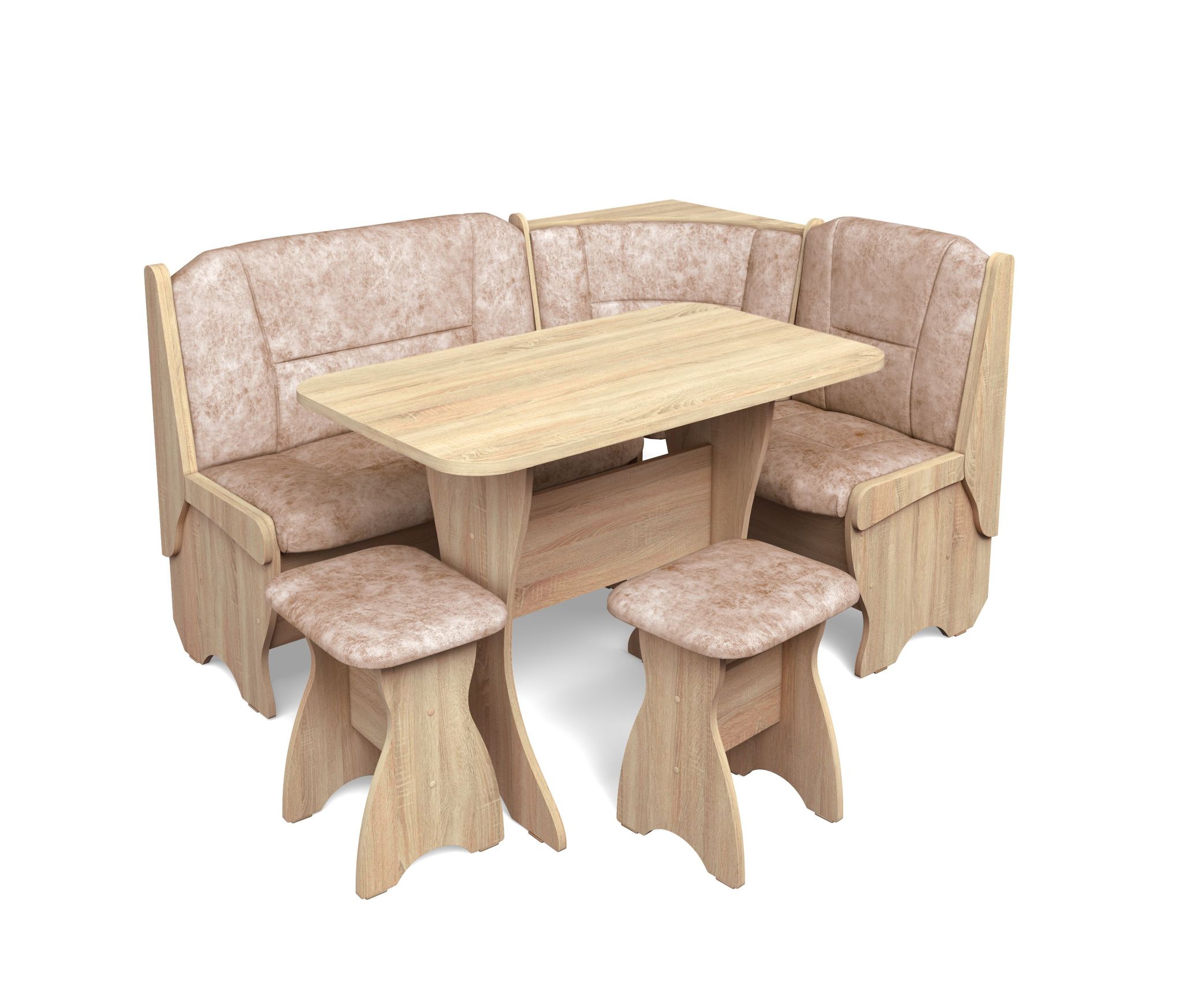 Набор мебели для кухни включающий в себя угловую скамью, стол и два табурета.