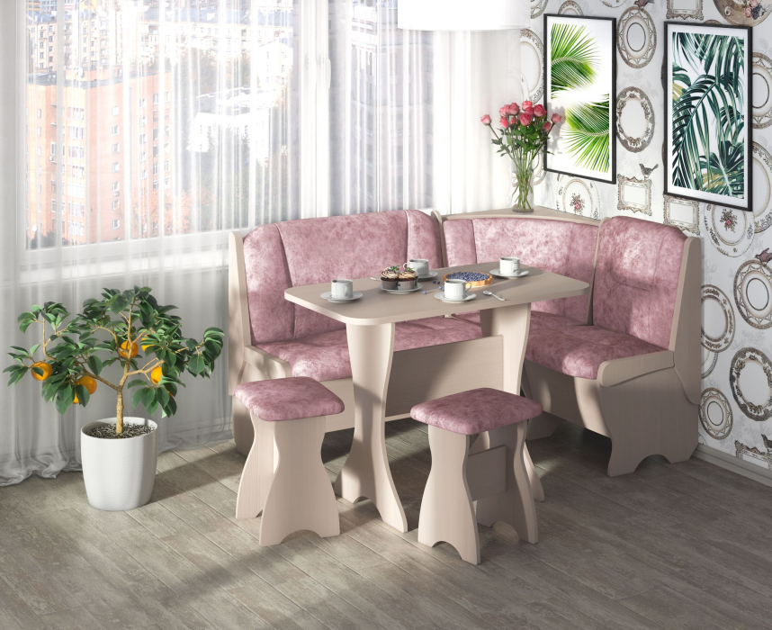 Набор мебели для кухни включающий в себя угловую скамью, стол и два табурета.