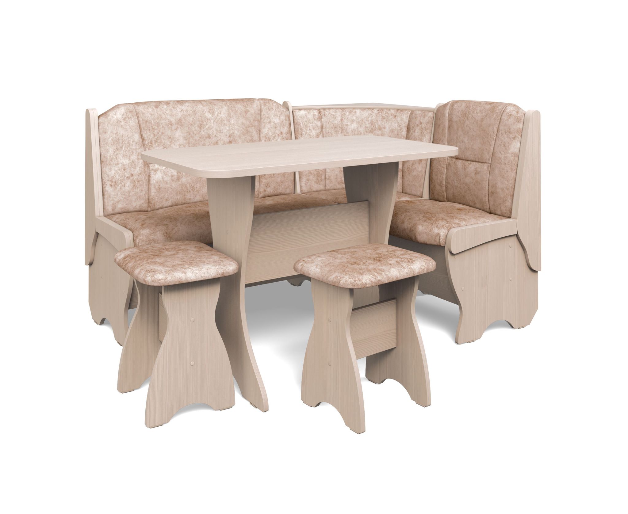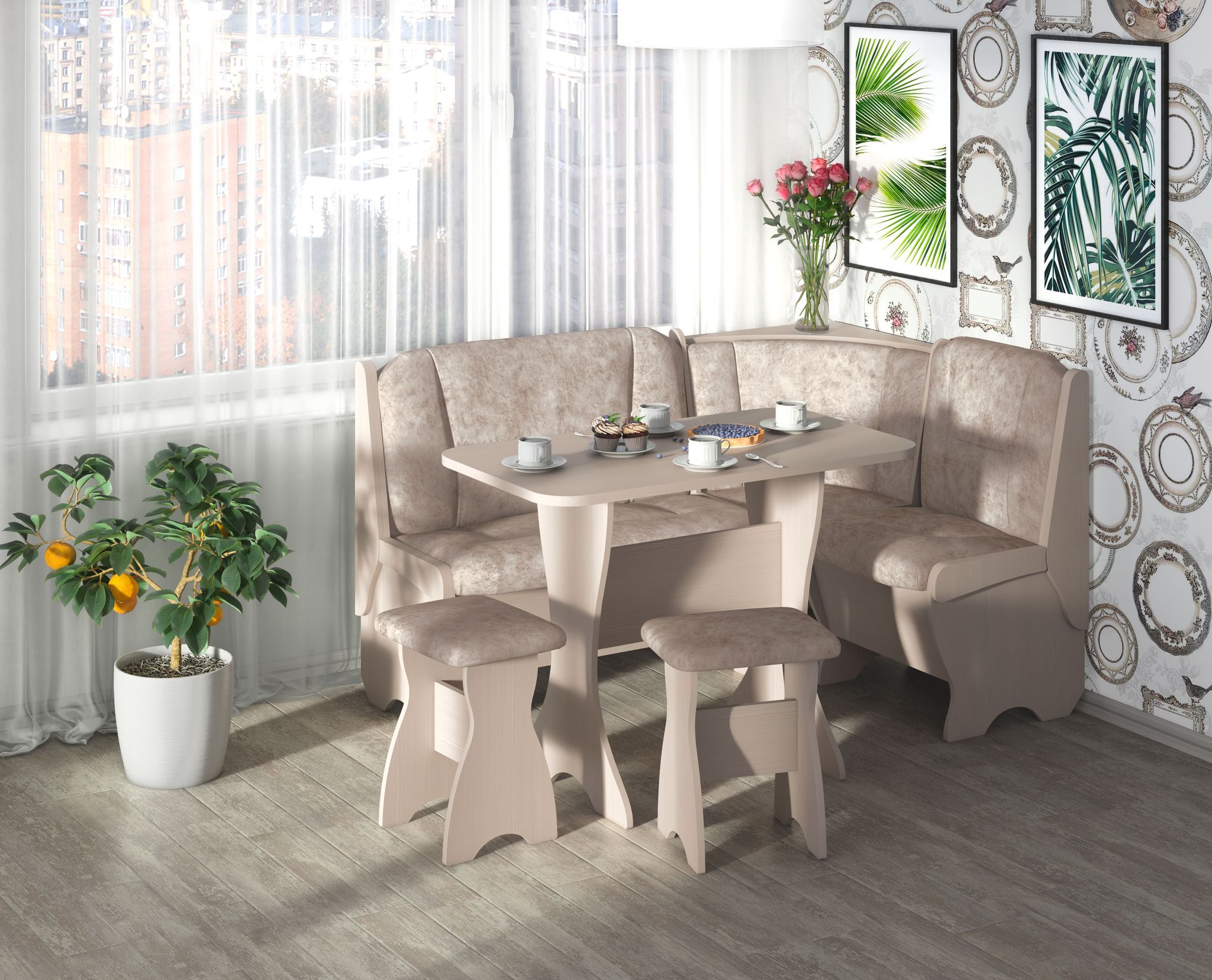 Набор мебели для кухни включающий в себя угловую скамью, стол и два табурета.