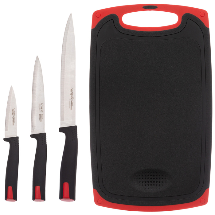 НАБОР НОЖЕЙ AGNESS С РАЗДЕЛОЧНОЙ ДОСКОЙ, 4 ПРЕДМЕТА (Черный/Красный)