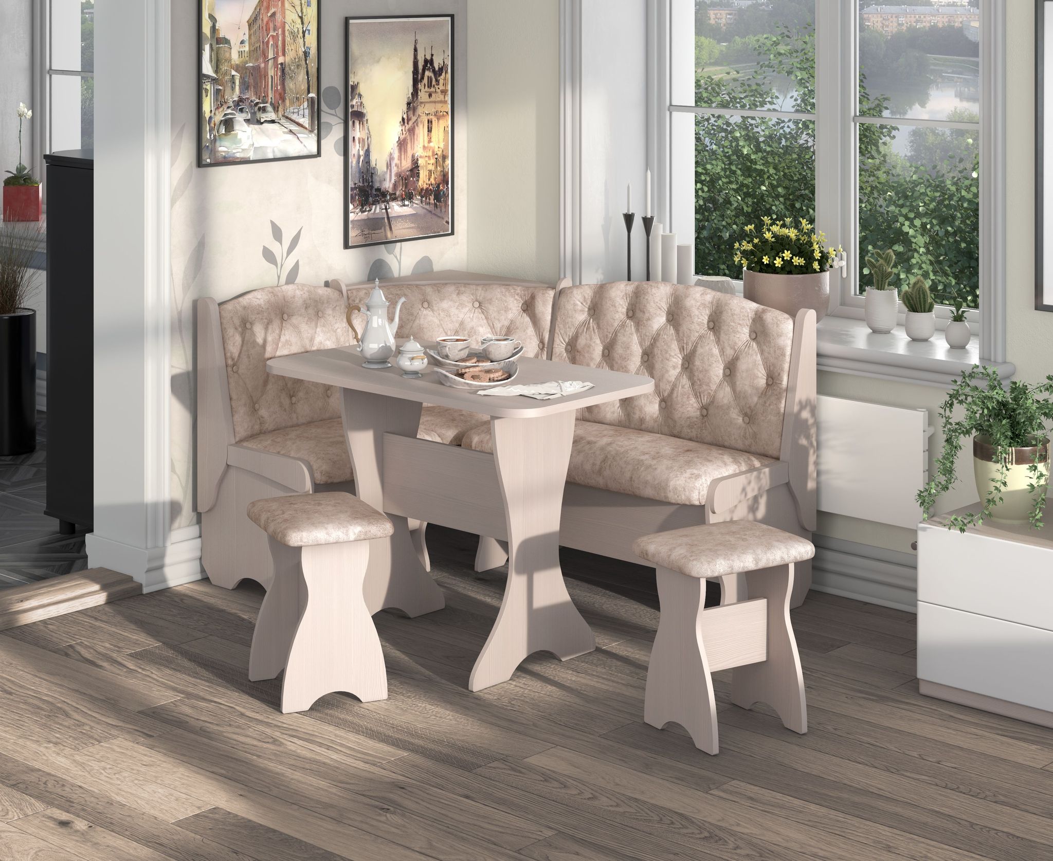 Набор мебели для кухни включающий в себя угловую скамью, стол и два табурета.