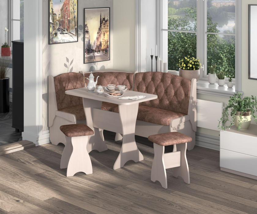 Набор мебели для кухни включающий в себя угловую скамью, стол и два табурета.