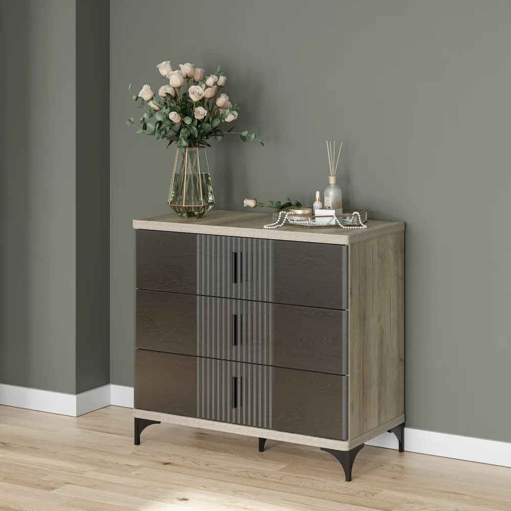 Прямой комод-тумба имеет три выдвижных ящика с использованием механизма полного выдвижения и плавного закрывания, дно ящика выполнено из ЛДВП в цвет корпуса