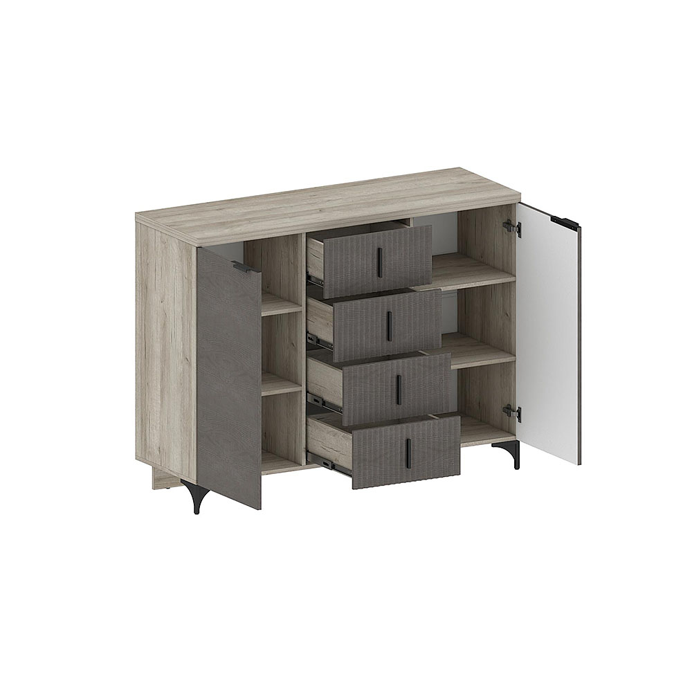 Комод КМ-2303 Шер из набора модульной спальни Шер – самый большой и вместительный. Это комбинированный комод: помимо четырёх выдвижных ящиков с направляющими полного выдвижения, слева и справа добавлены секции с полками, что значительно добавляет места.