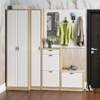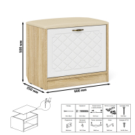 Компактная маленькая обувница без полок за откидной дверкой. За откидной дверцей достаточно места для нескольких пар обуви. Обувница оборудована мягким сиденьем - ее можно использовать в качестве банкетки с комфортом обуваясь перед выходом. Для фиксации откидного фасада используется газлифт мебельный. Максимальная нагрузка составляет 5 кг. Ручка в виде скобы выполнена из металла в цвете бронза. Декоративная фрезеровка Ромб служит отличным дополнением к общему светлому тону фасада. Дверь закреплена на четырёхшарнирных петлях. Фасад выполнен из МДФ односторонней белой 16 мм. и покрыта плёнкой ПВХ 0,3 мм. белое дерево. Корпус выполнен из ламинированной ДСП 16 мм., которая имеет гигиенический сертификат Е1 и относится к самой безопасной группе ДСП. Торцы деталей облицованы кромкой ПВХ 2 мм. и 0,4 мм., что улучшает эстетический вид и продлевает срок службы обувнице. Поставляется обувница с мягким сиденьем П-6 в разобранном виде в надёжной упаковке, с комплектом сборочной фурнитуры и инструкцией по сборке. Изображения обувницы с мягким сиденьем П-6 Вы можете найти выше в начале страницы.