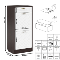 Высокая обувница оборудована ящиком для мелочей сверцу и двумя отделениями с откидными фасадами для обуви. Для фиксации откидных фасадов используется газлифт мебельный. Максимальная нагрузка составляет 5 кг. Ручки в виде скоб выполнены из металла в цвете бронза. Декоративная фрезеровка Ромб служит отличным дополнением к общему светлому тону фасада. Выдвижной ящик установлен на металлические направляющие, обеспечивающие надёжное прямолинейное движение. Дверь закреплена на четырёхшарнирных петлях. Фасад выполнен из МДФ односторонней белой 16 мм. и покрыта плёнкой ПВХ 0,3 мм. белое дерево. Корпус выполнен из ламинированной ДСП 16 мм., которая имеет гигиенический сертификат Е1 и относится к самой безопасной группе ДСП. Торцы деталей облицованы кромкой ПВХ 2 мм. и 0,4 мм., что улучшает эстетический вид и продлевает срок службы обувнице. На опорах мебели используются пластиковые подпятники, сохраняющие Ваше напольное покрытие от повреждений. Поставляется обувница высокая с ящиком П-6 в разобранном виде в надёжной упаковке, с комплектом сборочной фурнитуры и инструкцией по сборке. Изображения обувницы высокой с ящиком П-6 Вы можете найти выше в начале страницы.