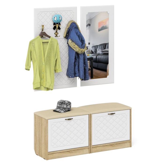 Отзывы о Столплит Две обувницы с сиденьем зеркалом и вешалкой П-6 МДФ фрезеровка ромб Белое дерево/дуб сонома