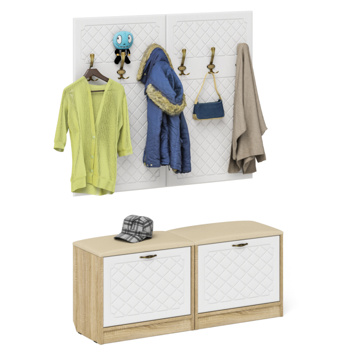 Отзывы о Столплит Две обувницы с мягким сиденьем с двумя вешалками для одежды П-6 МДФ фрезеровка ромб Белое дерево/дуб сонома