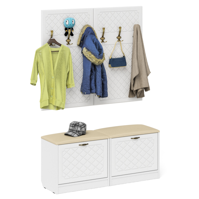 Комплектация состоит из двух обувниц и двух навесных вешалок. Компактные маленькие обувницы без полок за откидной дверкой объединены в единый блок. За откидной дверцей каждой достаточно места для нескольких пар обуви. Обувницы оборудована мягким сиденьем - их можно использовать в качестве банкетки с комфортом обуваясь перед выходом. Для фиксации откидных фасадов используется газлифт мебельный. Максимальная нагрузка составляет 5 кг. Прямоугольная настенная вешалка с крючками состоит из двух панелей П-6 Вшк. Каждая оборудована тремя трехрожковыми крючками для одежды. Глубина вешалки - 16 мм., 9,3 см.- это глубина с учетом крючков. Крепления вешалок к стене в комплектацию не входит. Ручки в виде скоб выполнены из металла в цвете бронза. Декоративная фрезеровка Ромб служит отличным дополнением к общему светлому тону фасада. Двери закреплены на четырёхшарнирных петлях. Фасады выполнены из МДФ односторонней белой 16 мм. и покрыта плёнкой ПВХ 0,3 мм. белое дерево. Корпуса выполнены из ламинированной ДСП 16 мм., которая имеет гигиенический сертификат Е1 и относится к самой безопасной группе ДСП. Торцы деталей облицованы кромкой ПВХ 2 мм. и 0,4 мм., что улучшает эстетический вид и продлевает срок службы обувнице. На опорах мебели используются пластиковые подпятники, сохраняющие Ваше напольное покрытие от повреждений. Поставляются две обувницы с мягким сиденьем с двумя вешалками для одежды П-6 в разобранном виде в надёжной упаковке, с комплектом сборочной фурнитуры и инструкцией по сборке. Изображения двух обувниц с мягким сиденьем с двумя вешалками для одежды П-6 Вы можете найти выше в начале страницы.