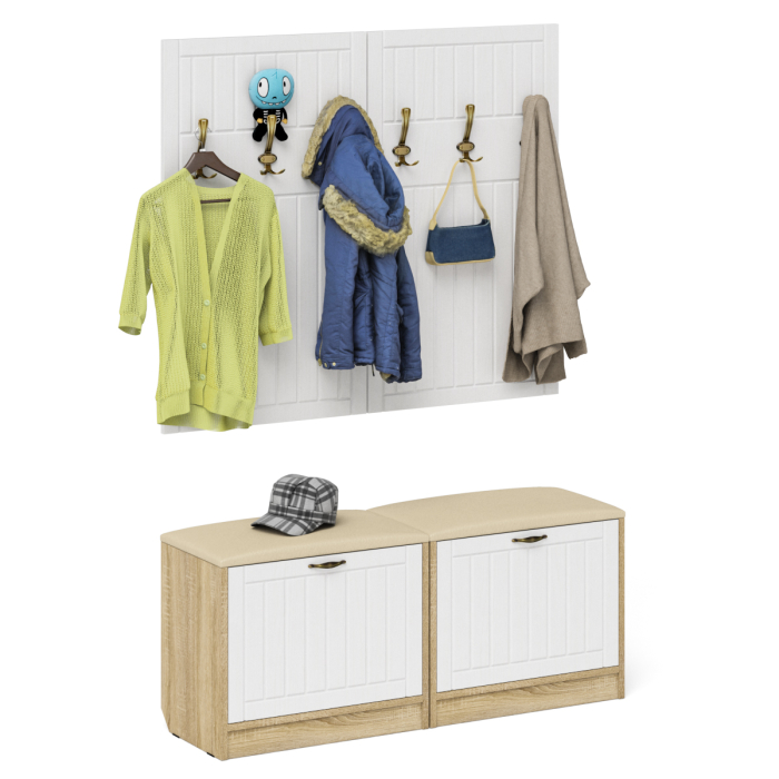 Две обувницы с мягким сиденьем с двумя вешалками для одежды П-6 - простая, аккуратная и практичная мебель для современного интерьера.
