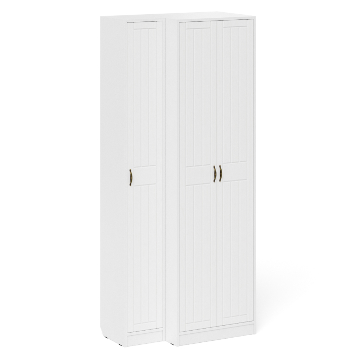 Комплектация состоит из шкафа для одежды и пенала объединенных в единый блок. Классический шкаф за распашными дверками которого расположены антресольная полка для головных уборов, горизонтальная штанга и нижняя ниша для обуви. Классический узкий пенал, за распашной дверью которого расположены 4 полки. Сторону открывания двери Вы определяете при сборке, что расширяет возможности удобной меблировки прихожей. Ручки в виде скоб выполнены из металла в цвете бронза. Двери закреплены на четырёхшарнирных петлях.