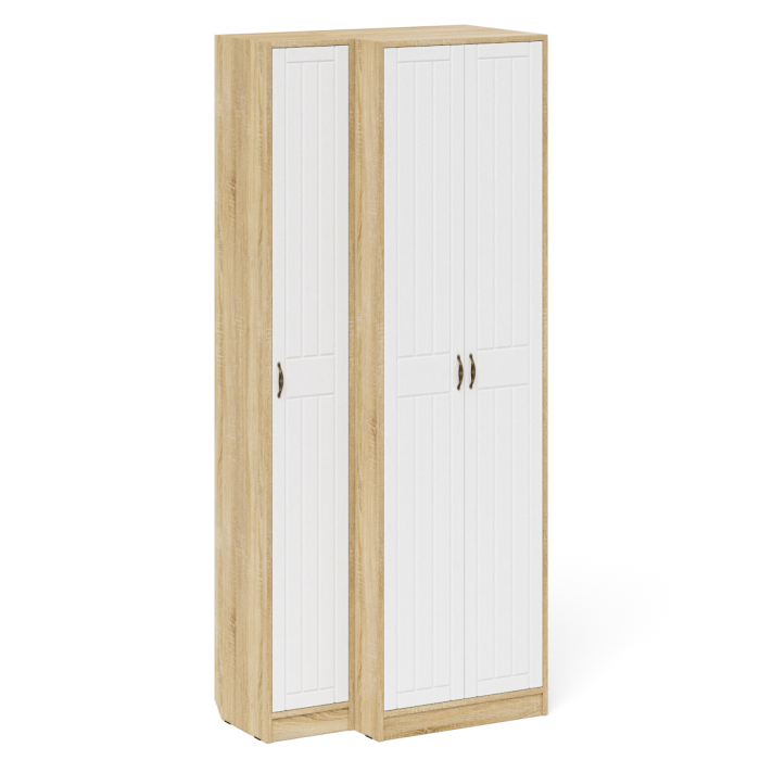Комплектация состоит из шкафа для одежды и пенала объединенных в единый блок. Классический шкаф за распашными дверками которого расположены антресольная полка для головных уборов, горизонтальная штанга и нижняя ниша для обуви. Классический узкий пенал, за распашной дверью которого расположены 4 полки. Сторону открывания двери Вы определяете при сборке, что расширяет возможности удобной меблировки прихожей. Ручки в виде скоб выполнены из металла в цвете бронза. Двери закреплены на четырёхшарнирных петлях.