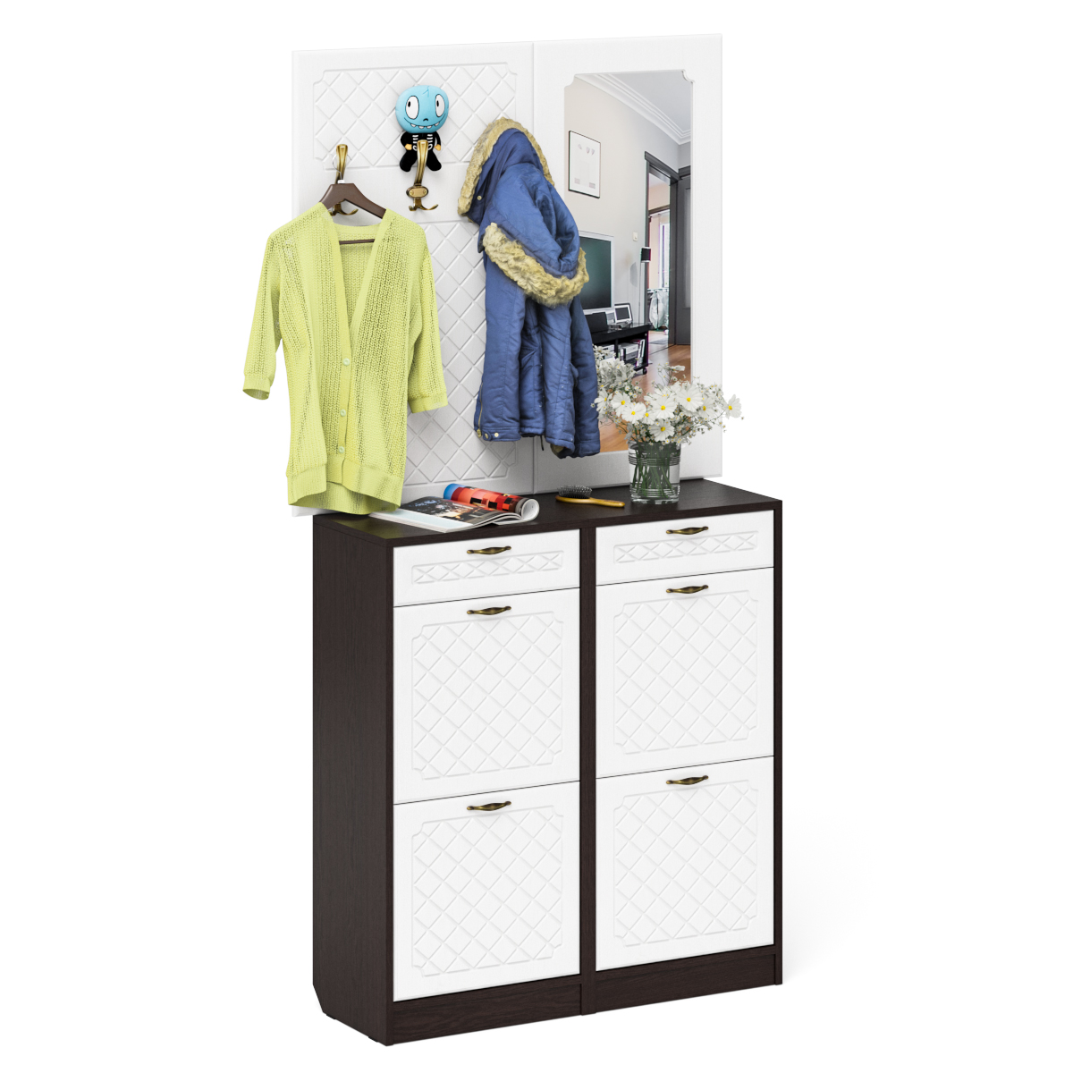 Отзывы о Столплит Две тумбы для обуви с ящиками с вешалкой и зеркалом П-6 № 05 МДФ фрезеровка ромб Белый/Венге