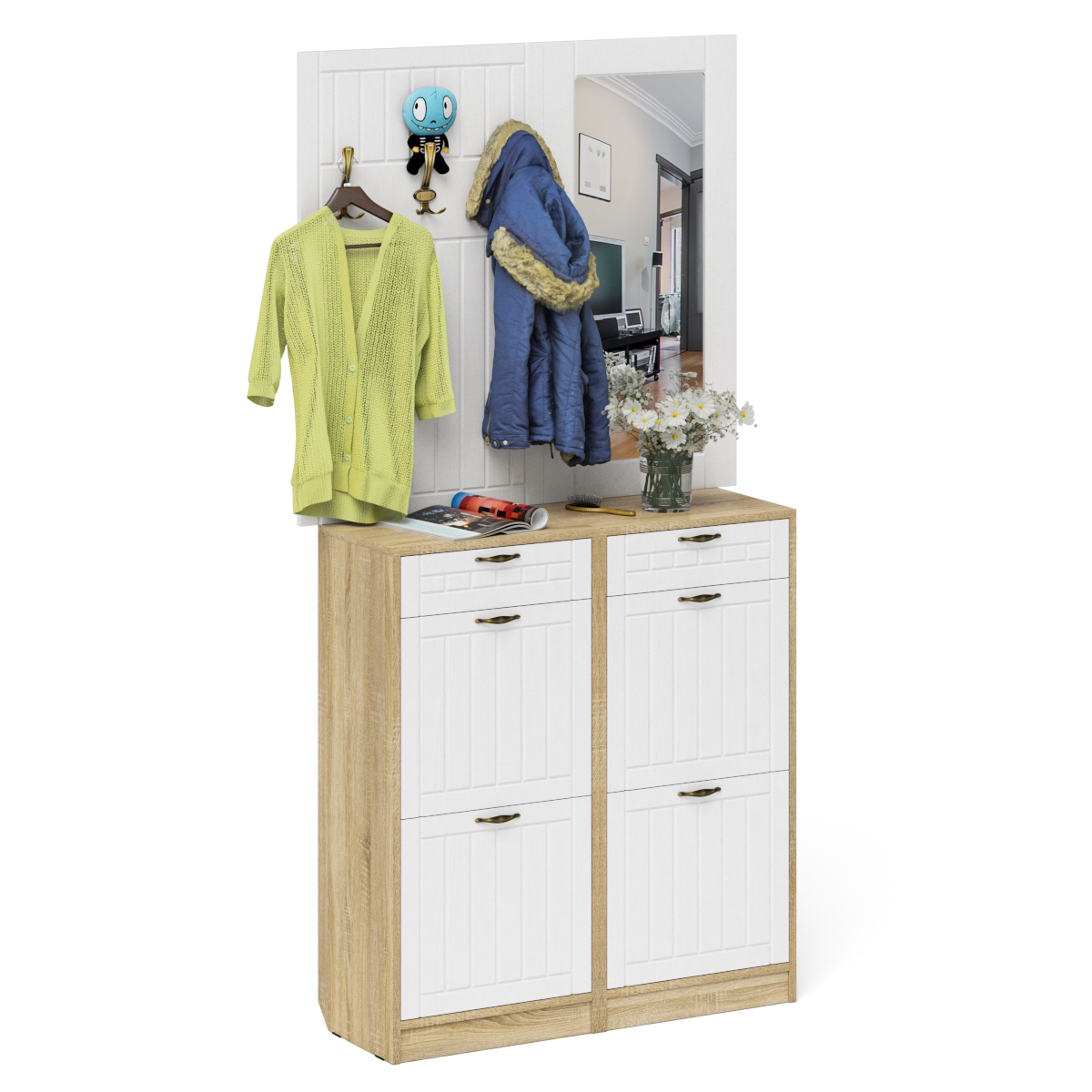 Отзывы о Столплит Две тумбы для обуви с ящиками с вешалкой и зеркалом П-6 № 05 МДФ фрезеровка прованс Белое дерево/дуб сонома