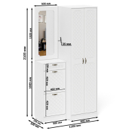 Комплектация состоит из шкафа для одежды, высокой обувницы и навесного зеркала. Классический шкаф за распашными дверками которого расположены антресольная полка для головных уборов, горизонтальная штанга и нижняя ниша для обуви. Высокая обувница оборудована ящиком для мелочей сверху и двумя отделениями с откидными фасадами для обуви. Для фиксации откидного фасада используется газлифт мебельный. Максимальная нагрузка составляет 5 кг. Зеркало в раме из МДФ. Крепления зеркала к стене в комплектацию не входит. Ручки в виде скоб выполнены из металла в цвете бронза. Выдвижной ящик установлен на металлические направляющие, обеспечивающие надёжное прямолинейное движение. Двери закреплены на четырёхшарнирных петлях. Фасады выполнены из МДФ односторонней белой 16 мм. и покрыта плёнкой ПВХ 0,3 мм. белое дерево. Декоративная фрезеровка Ромб служит отличным дополнением к общему светлому тону фасада. Корпуса выполнены из ламинированной ДСП 16 мм., которая имеет гигиенический сертификат Е1 и относится к самой безопасной группе ДСП. Торцы деталей облицованы кромкой ПВХ 2 мм. и 0,4 мм., что улучшает эстетический вид и продлевает срок службы обувнице. На опорах мебели используются пластиковые подпятники, сохраняющие Ваше напольное покрытие от повреждений. Поставляются зеркало для прихожей с обувницей и шкафом П-6 № 17 в разобранном виде в надёжной упаковке, с комплектом сборочной фурнитуры и инструкцией по сборке. Изображения зеркала для прихожей с обувницей и шкафом П-6 № 17 Вы можете найти выше в начале страницы.