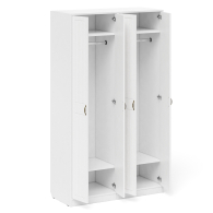 Комплектация состоит из двух шкафов для одежды объединенных в единый блок. Классический шкаф (в комплектации 2 единицы) за распашными дверками которого расположены антресольная полка для головных уборов, горизонтальная штанга и нижняя ниша для обуви. Ручки в виде скоб выполнены из металла в цвете бронза. Декоративная фрезеровка Ромб служит отличным дополнением к общему светлому тону фасада. Двери закреплены на четырёхшарнирных петлях. Фасады выполнены из МДФ односторонней белой 16 мм. и покрыта плёнкой ПВХ 0,3 мм. белое дерево. Корпуса выполнены из ламинированной ДСП 16 мм., которая имеет гигиенический сертификат Е1 и относится к самой безопасной группе ДСП. Торцы деталей облицованы кромкой ПВХ 2 мм. и 0,4 мм., что улучшает эстетический вид и продлевает срок службы обувнице. На опорах мебели используются пластиковые подпятники, сохраняющие Ваше напольное покрытие от повреждений. Поставляются два шкафа для прихожей П-6 в разобранном виде в надёжной упаковке, с комплектом сборочной фурнитуры и инструкцией по сборке. Изображения двух шкафов для прихожей П-6 Вы можете найти выше в начале страницы.