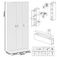 Комплектация состоит из трех узких пеналов объединненых в единый блок. Классический узкий пенал, за распашной дверью которого расположены 4 полки. В комплектации три пенала. Сторону открывания дверей Вы определяете при сборке, что расширяет возможности удобной меблировки прихожей. Ручки в виде скоб выполнены из металла в цвете бронза. Декоративная фрезеровка Ромб служит отличным дополнением к общему светлому тону фасада. Выдвижные ящики установлены на металлические направляющие, обеспечивающие надёжное прямолинейное движение. Двери закреплены на четырёхшарнирных петлях. Фасады выполнены из МДФ односторонней белой 16 мм. и покрыта плёнкой ПВХ 0,3 мм. белое дерево. Корпуса выполнены из ламинированной ДСП 16 мм., которая имеет гигиенический сертификат Е1 и относится к самой безопасной группе ДСП. Торцы деталей облицованы кромкой ПВХ 2 мм. и 0,4 мм., что улучшает эстетический вид и продлевает срок службы обувнице. На опорах мебели используются пластиковые подпятники, сохраняющие Ваше напольное покрытие от повреждений. Поставляются три пенала в прихожую П-6 в разобранном виде в надёжной упаковке, с комплектом сборочной фурнитуры и инструкцией по сборке. Изображения трех пеналов в прихожую П-6 Вы можете найти выше в начале страницы.